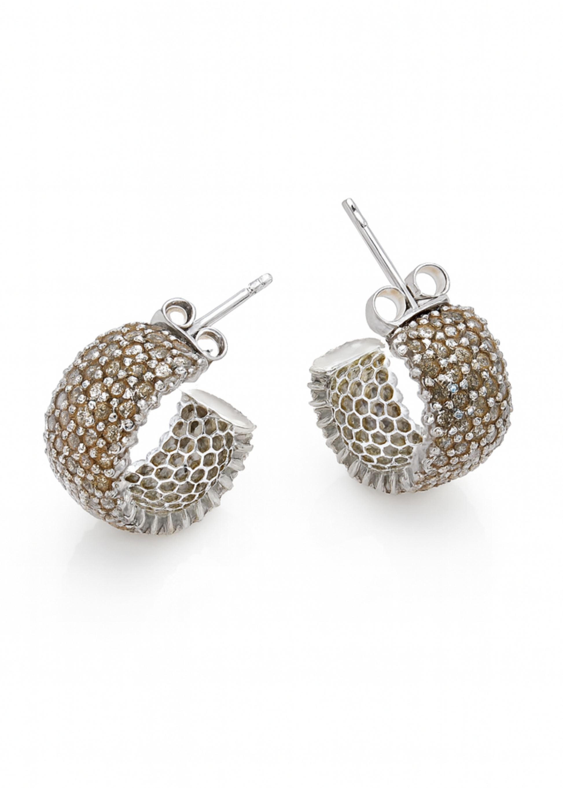 • Wide-band hoop silhouette with full champagne pavé detailing