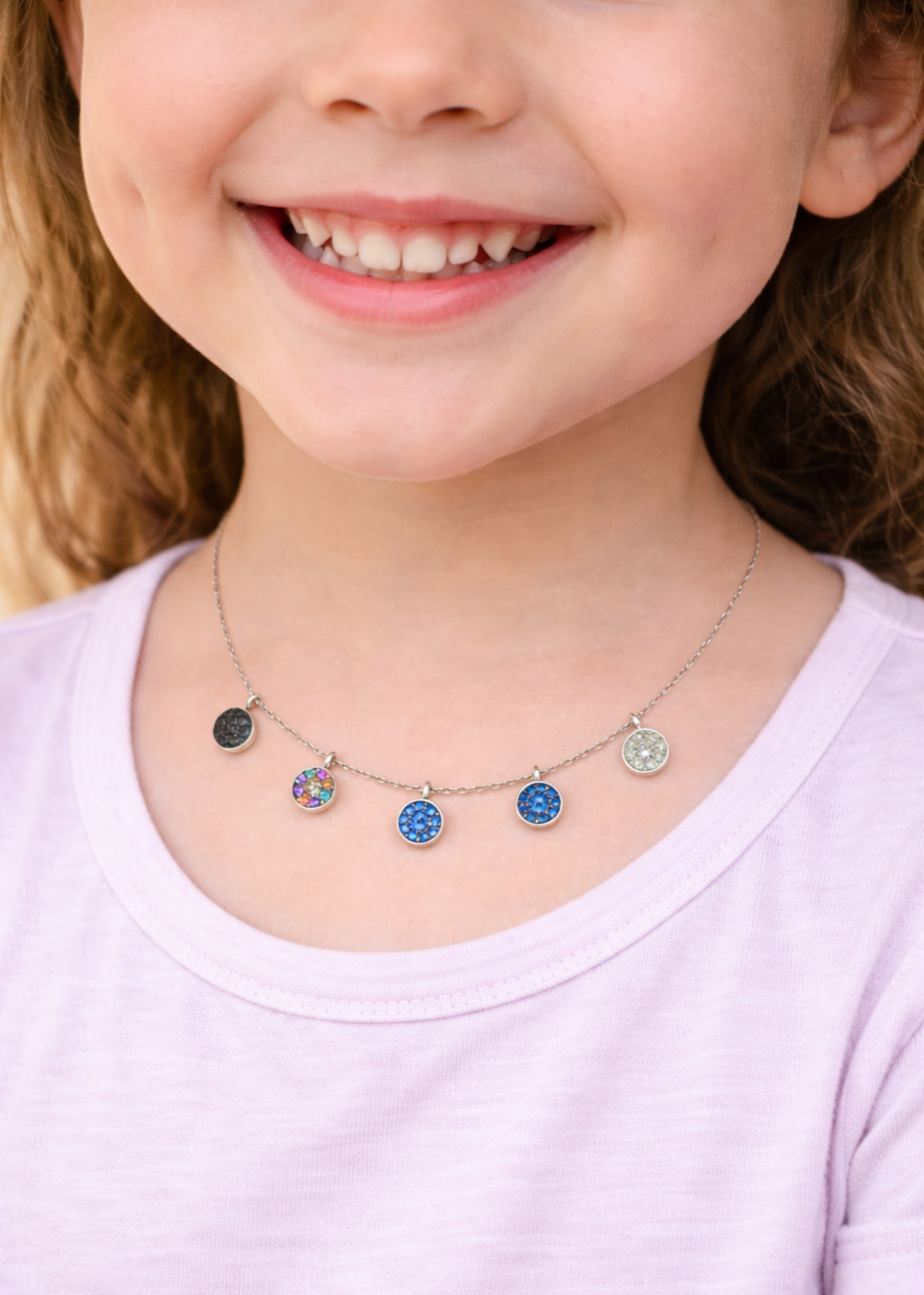 • Five shimmering pave-crystal charms in silver, blue, iridescent, and midnight tones