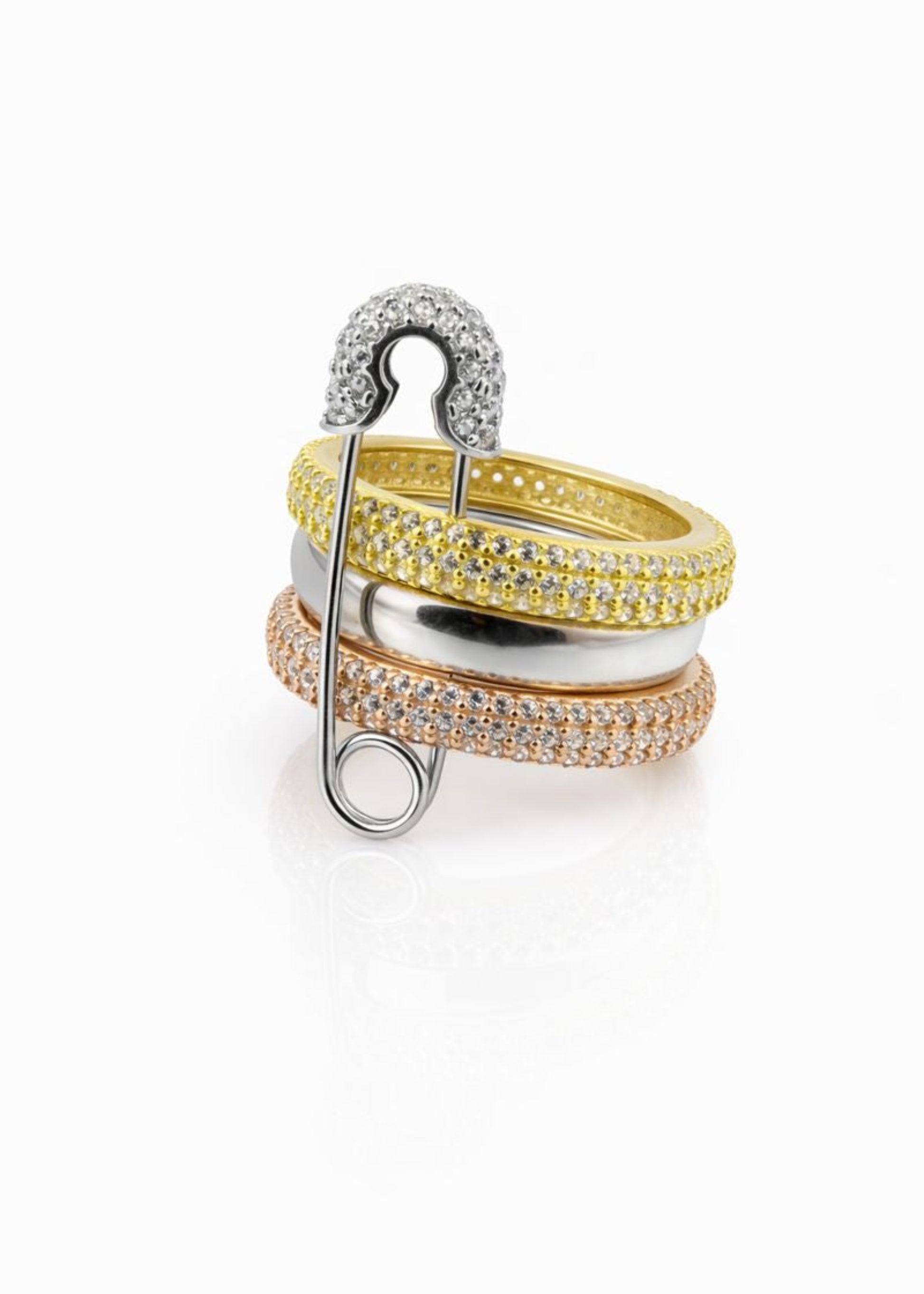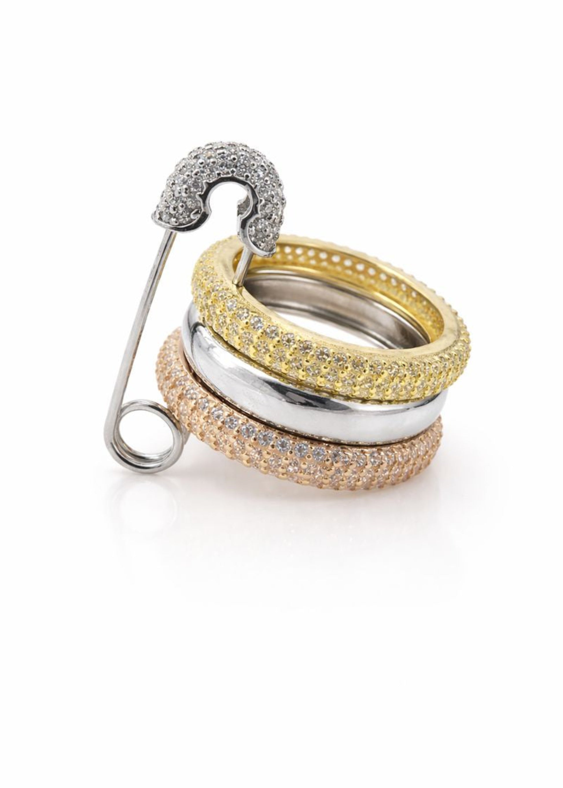 · Features three-layeredpavé-set bands in contrasting finishes for a bold, sculptural look