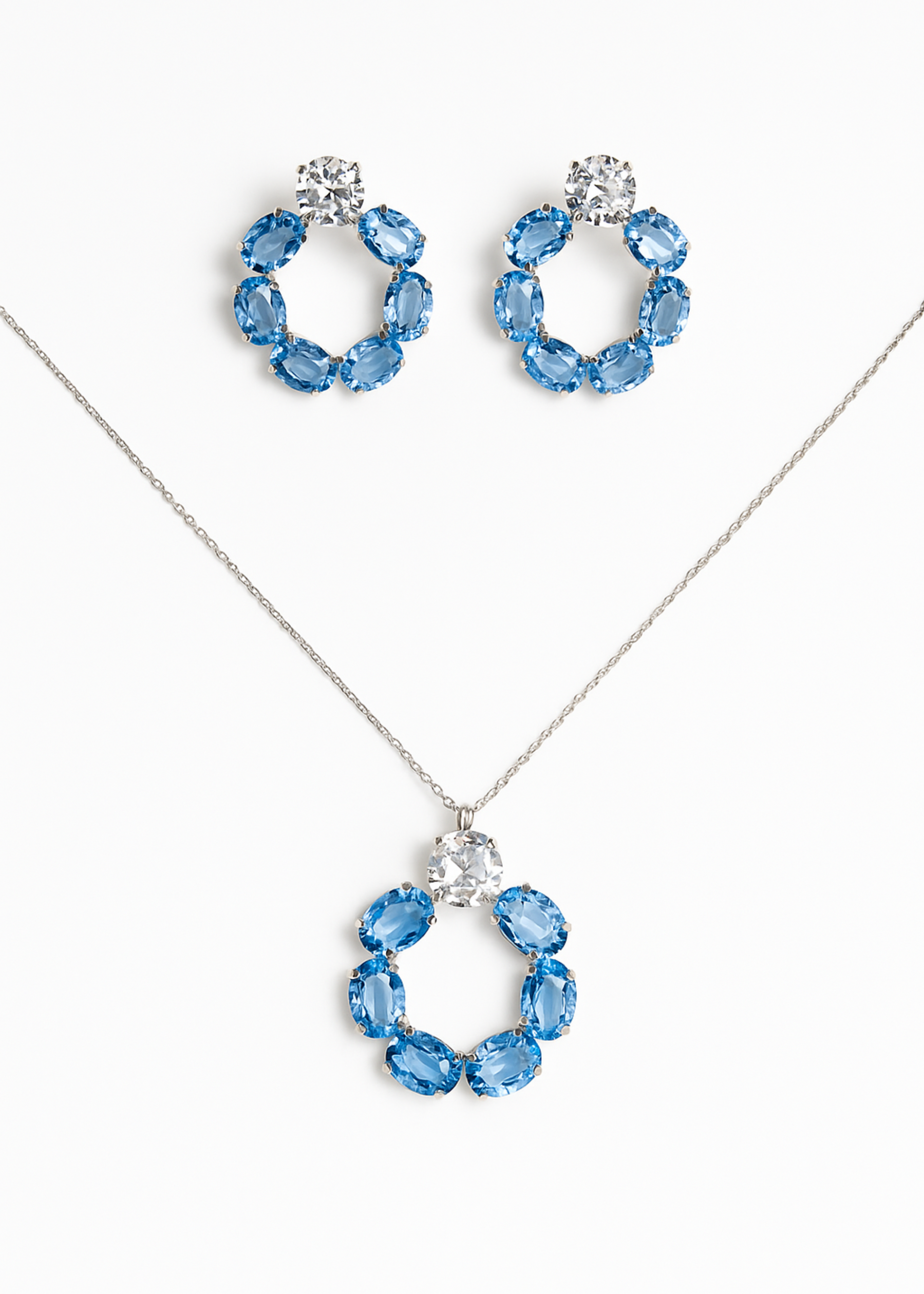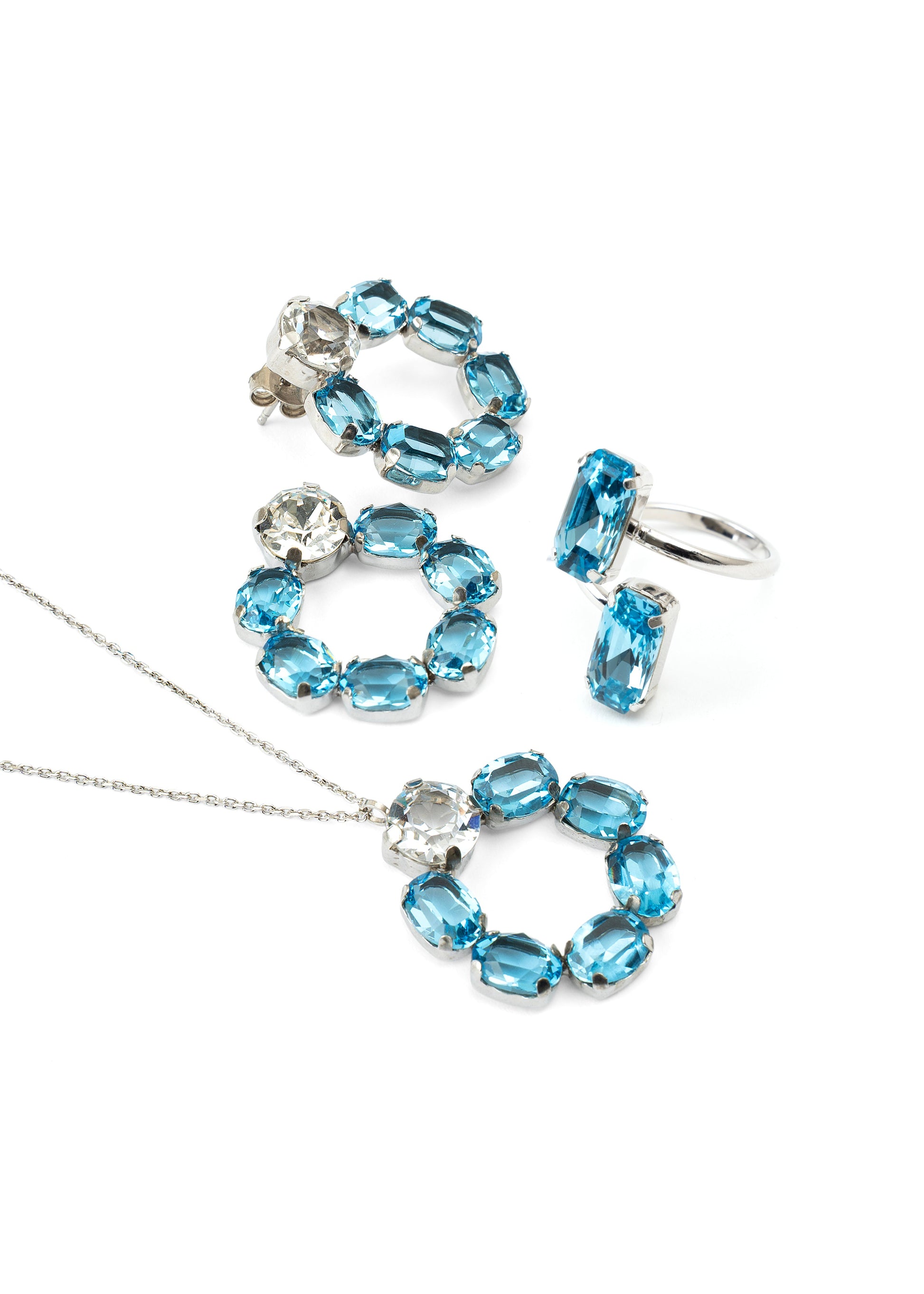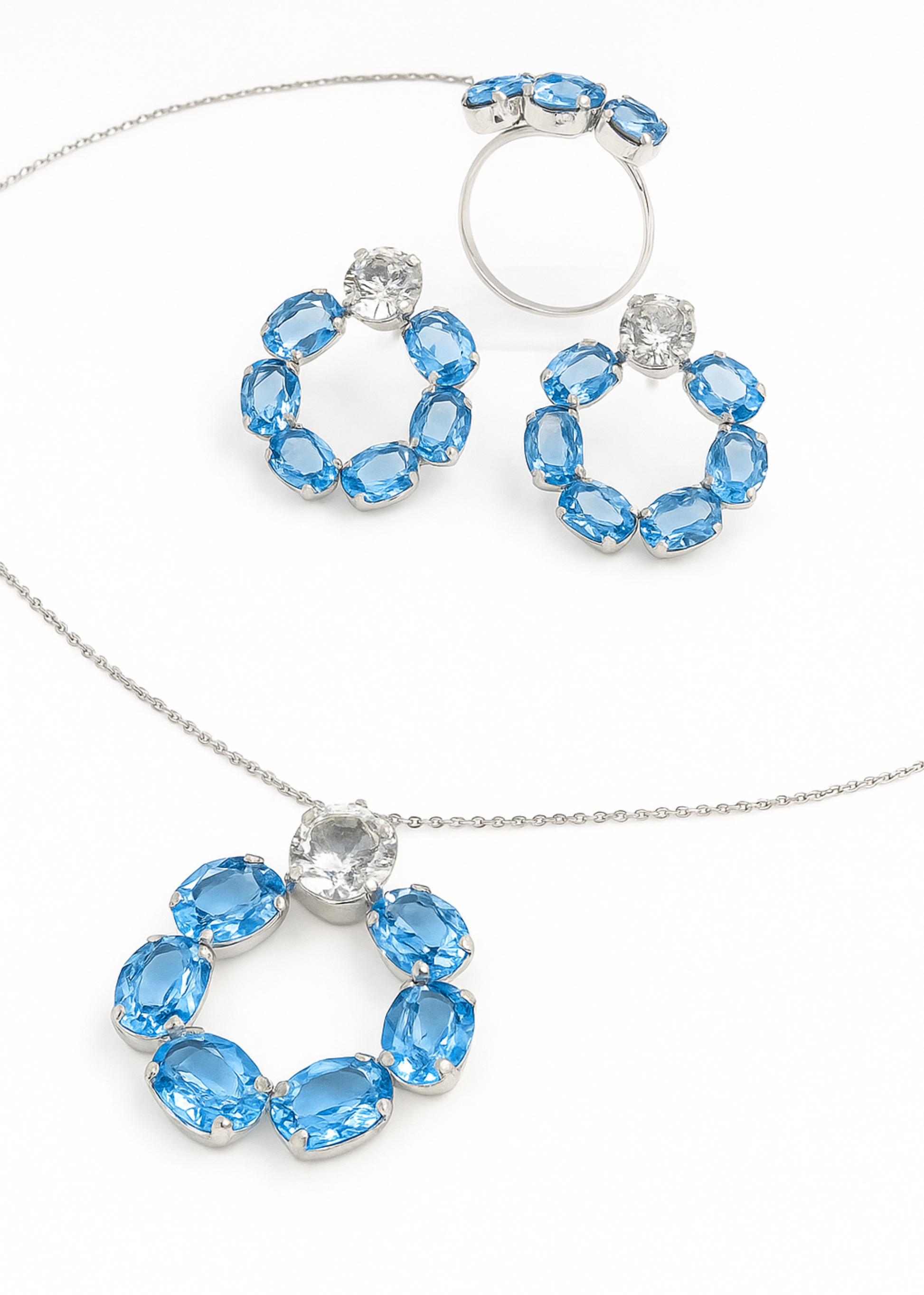 • The earrings and pendant feature an elegant open-circle design, created with a harmonious arrangement of oval sky-blue crystals