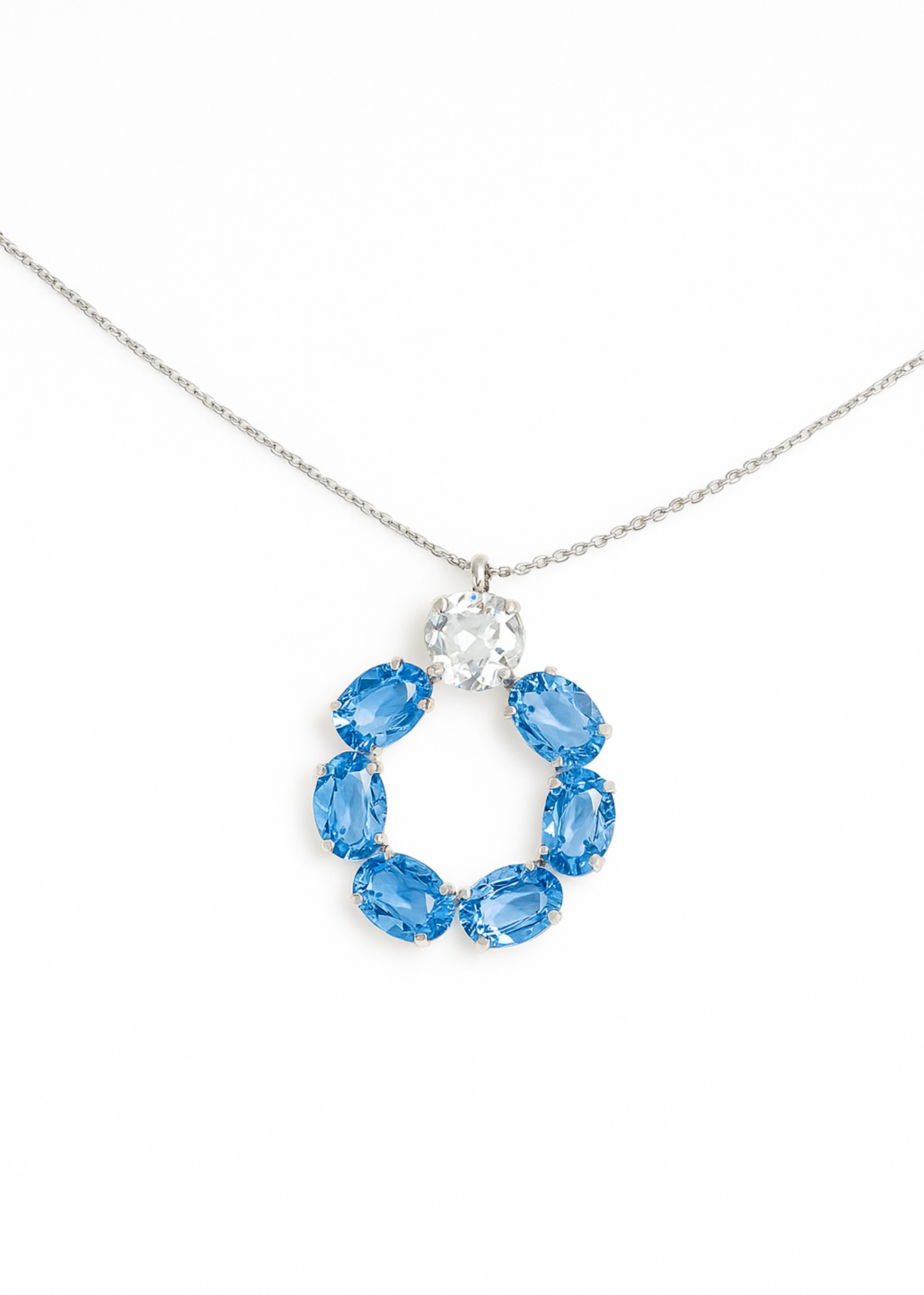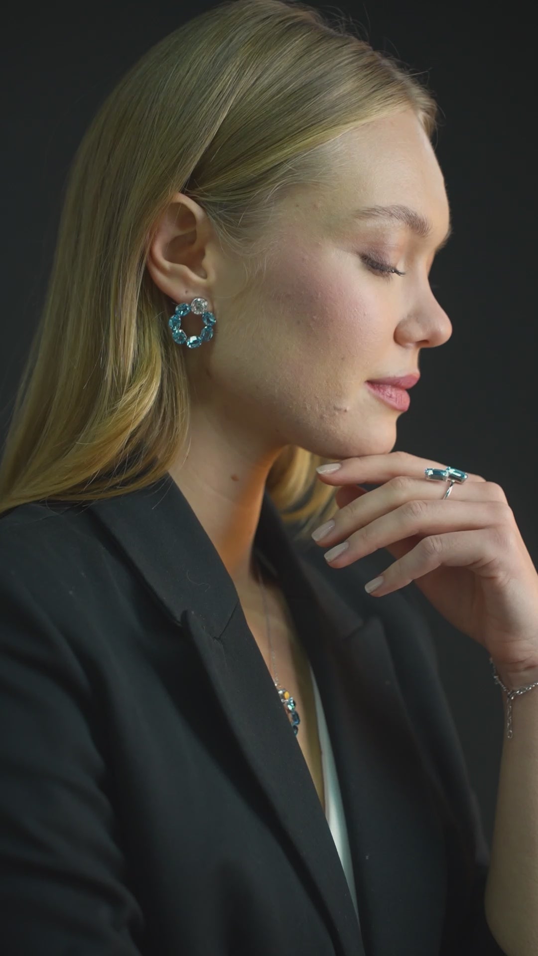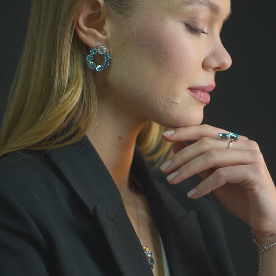 • The earrings and pendant feature an elegant open-circle design, created with a harmonious arrangement of oval sky-blue crystals