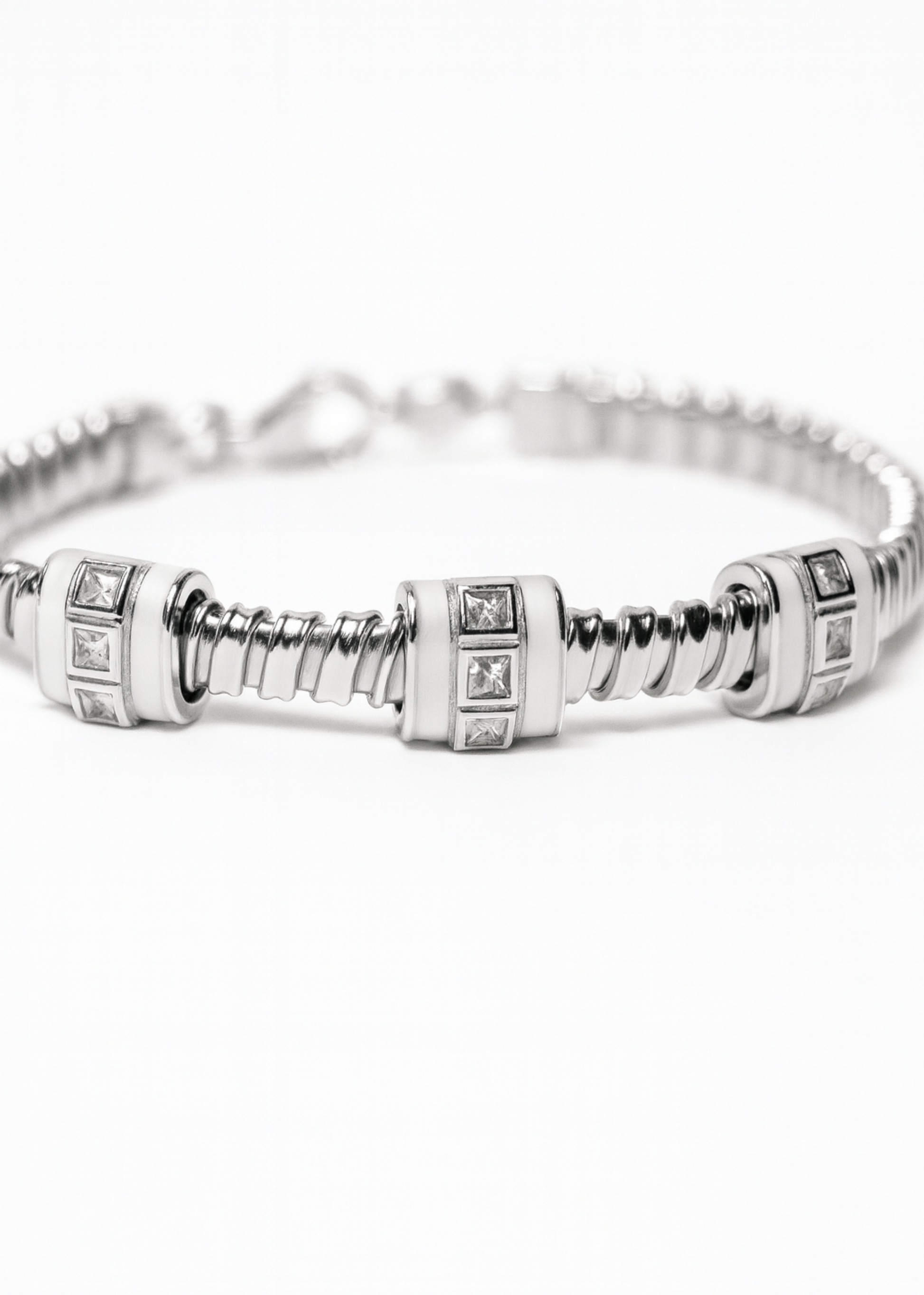 An ode to modern geometry, The Axis blends rhythmic symmetry with bold silver tones. The barrel-shaped spacers with square-set zirconia add depth and detail to this everyday luxury piece.