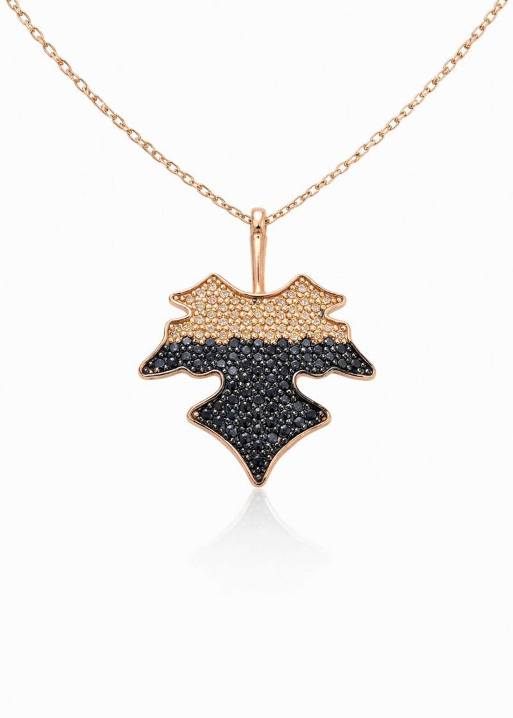 Crafted in fine silver and finished with a lustrous rhodium polish, this pendant features a beautifully contoured leaf motif adorned with shimmering black and champagne-toned stones. Suspended from a delicate chain, it balances contemporary charm with lasting sophistication.