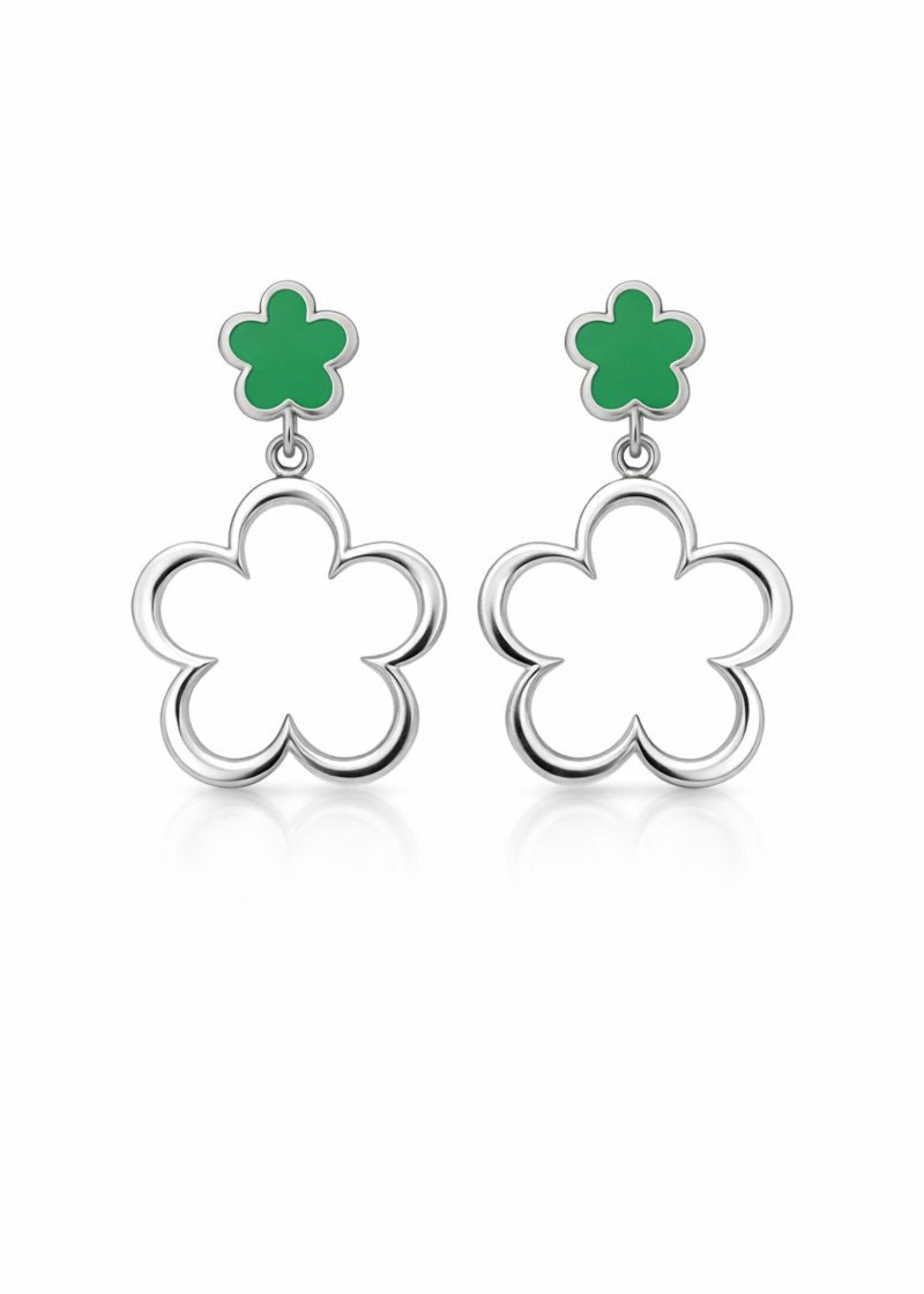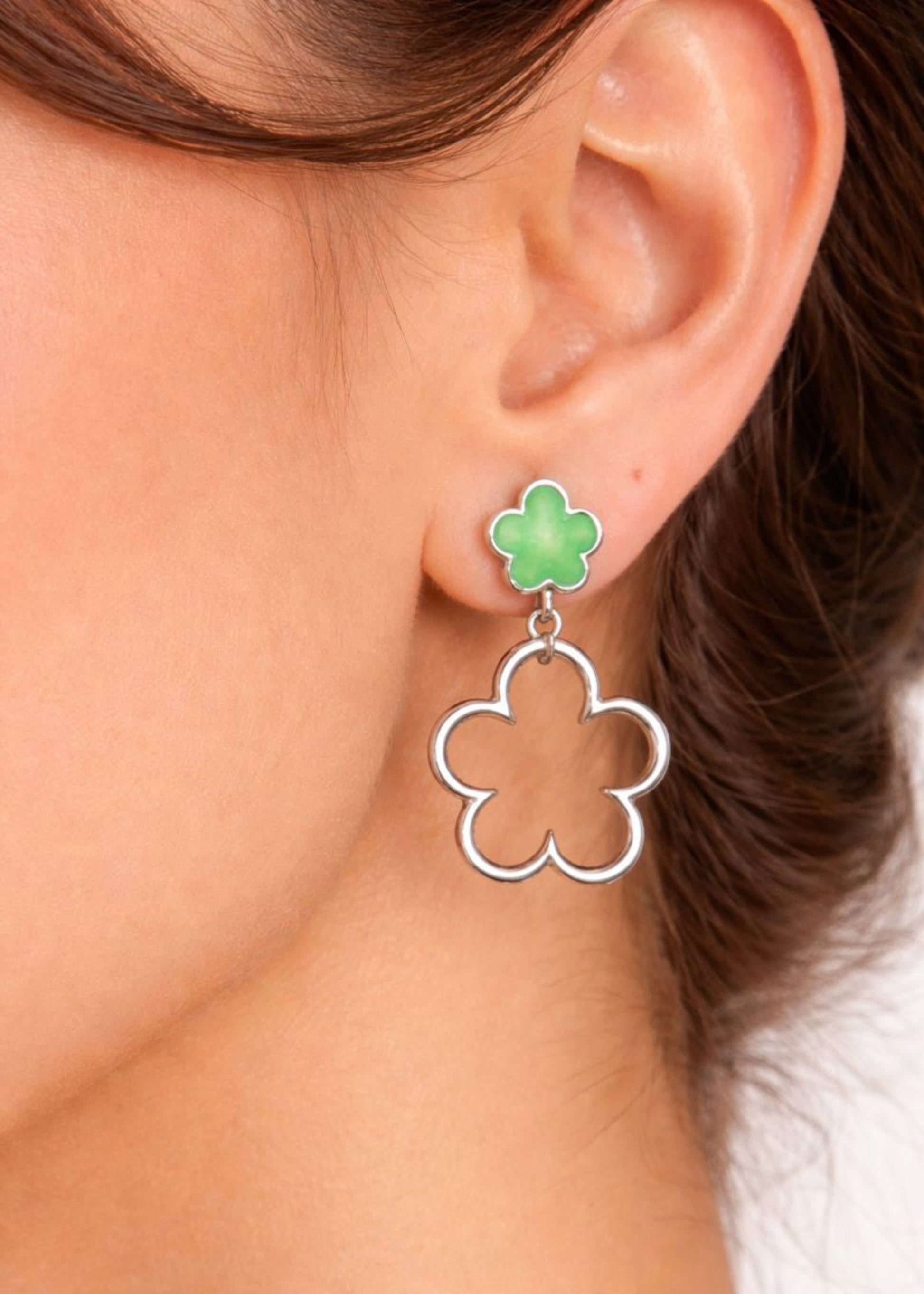 • Double-clover drop design with a bold green enamel top and open silver outline below