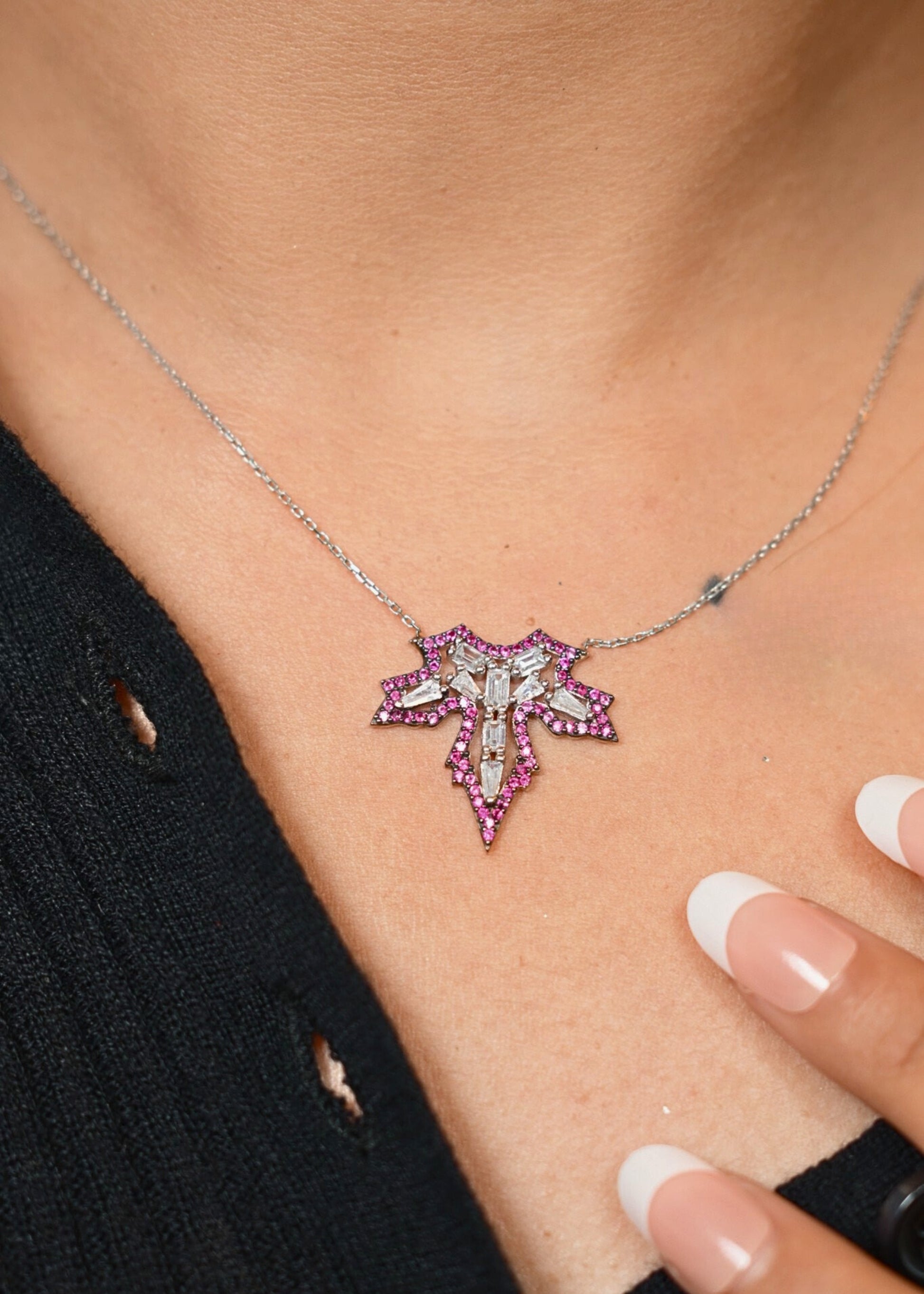 The Crimson Chinar Necklace is a striking fusion of strength and elegance. Crafted in 925 Sterling Silver, this pendant features a bold cross silhouette outlined with vivid pink stones and adorned with baguette-cut zirconia at the center — symbolizing courage, devotion, and inner light. A perfect statement piece for those who dare to stand out with grace and confidence.