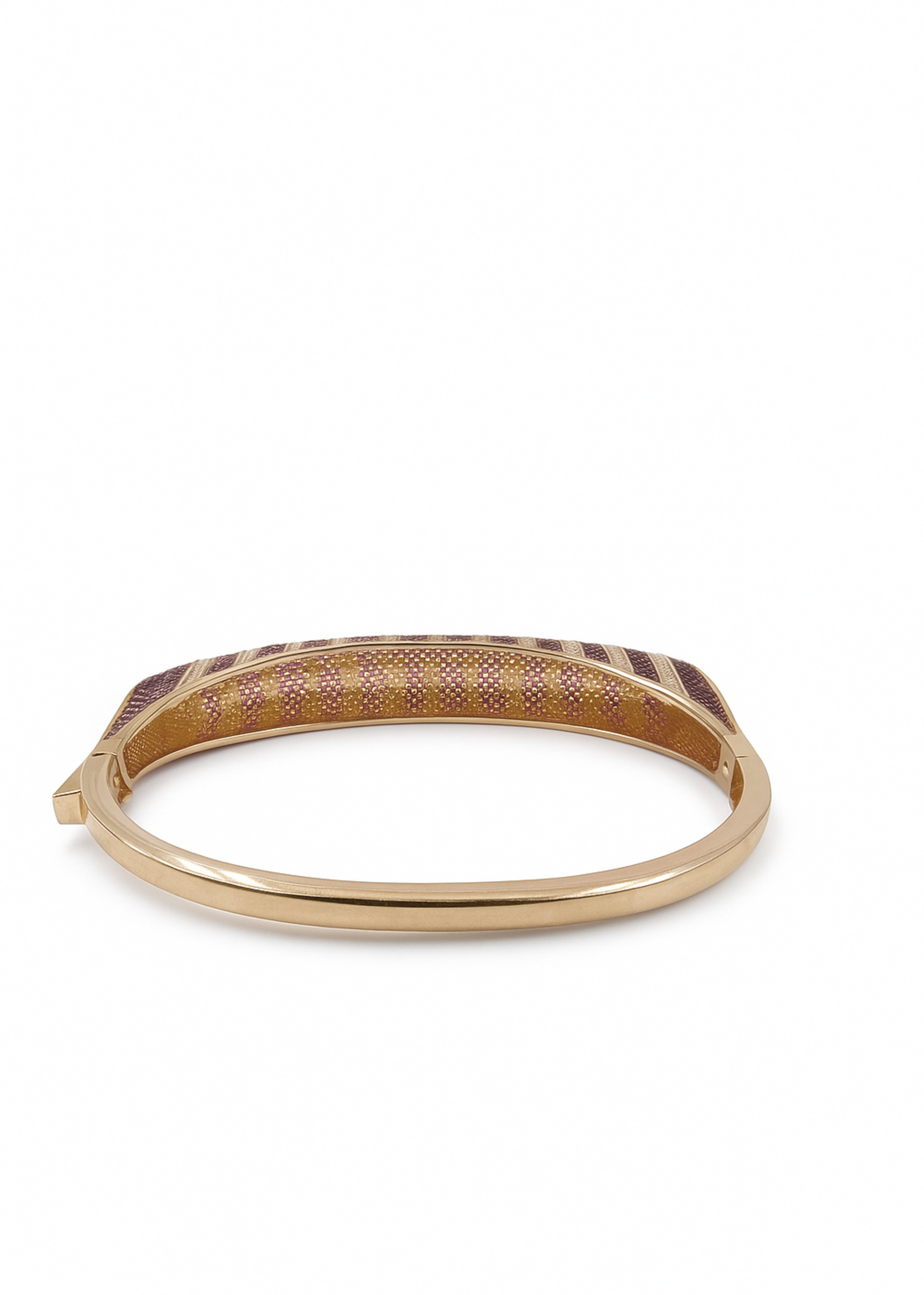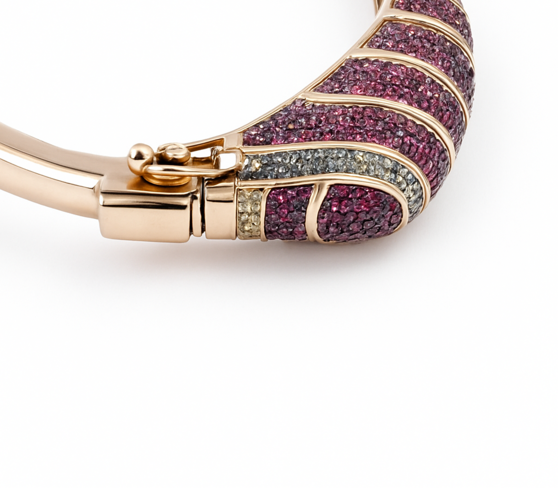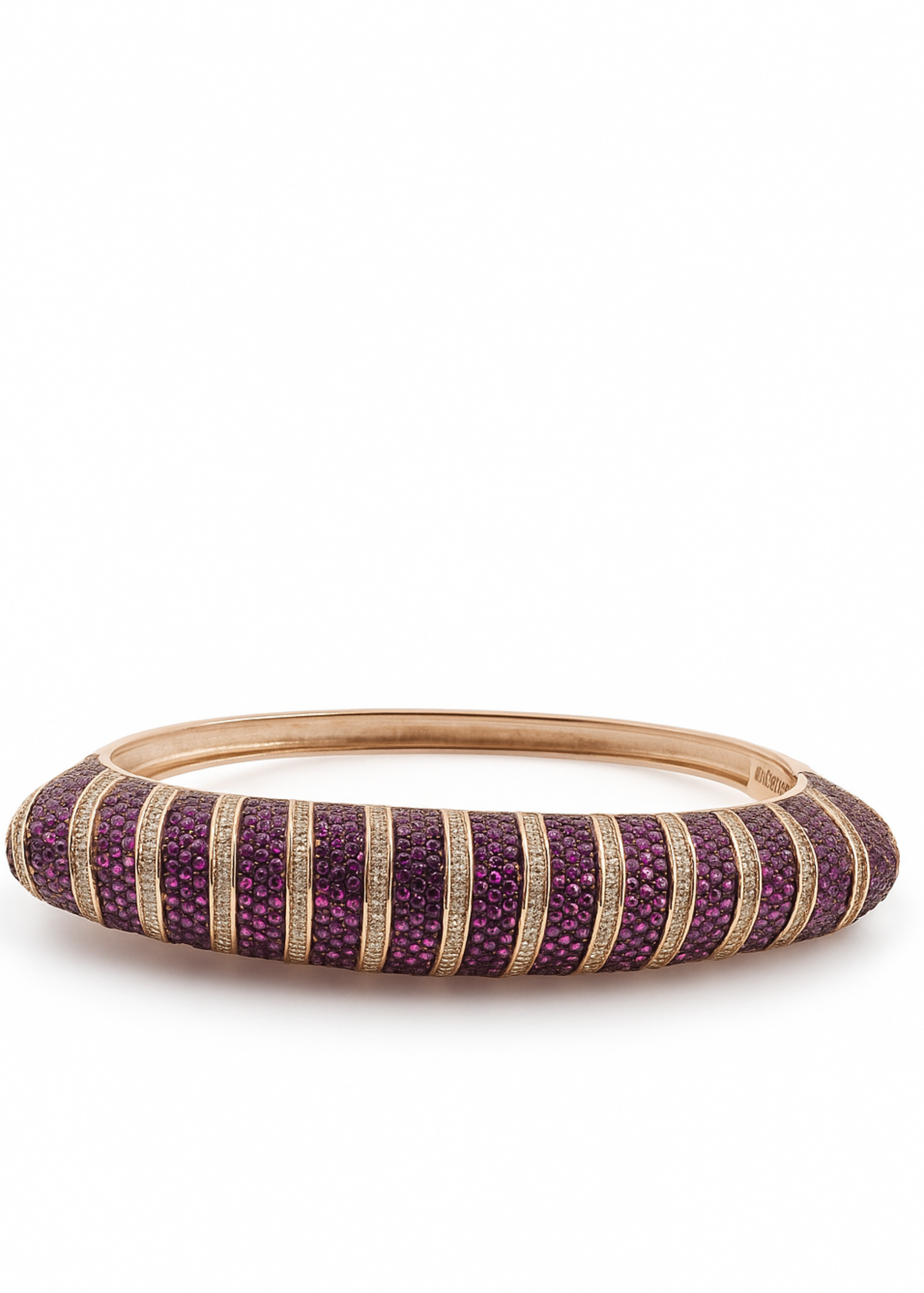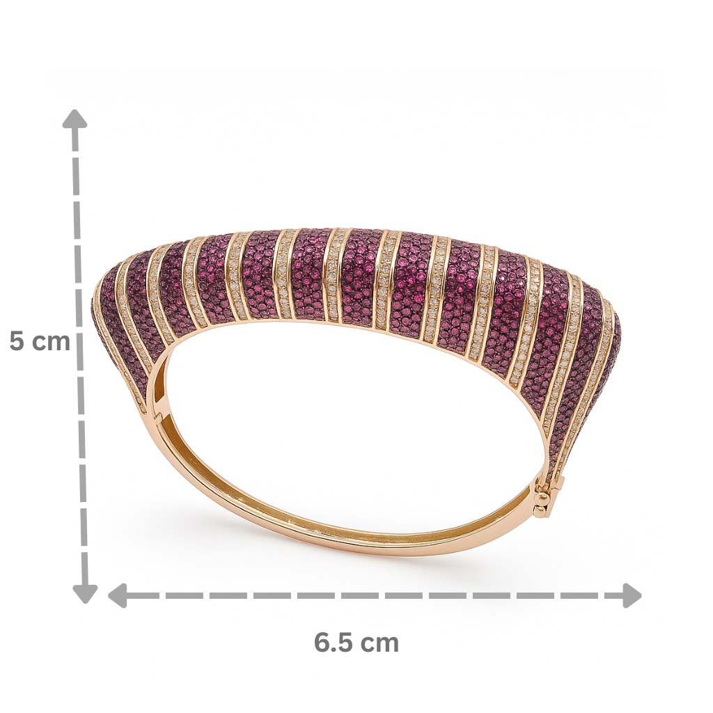 The Crimson Royale Bangle is inspired by the grandeur of royal regalia and timeless feminine power. Its bold form and exquisite craftsmanship echo the splendor of Mughal jewels, where precision and passion met in every gemstone. The deep ruby hue symbolizes strength, elegance, and everlasting allure.