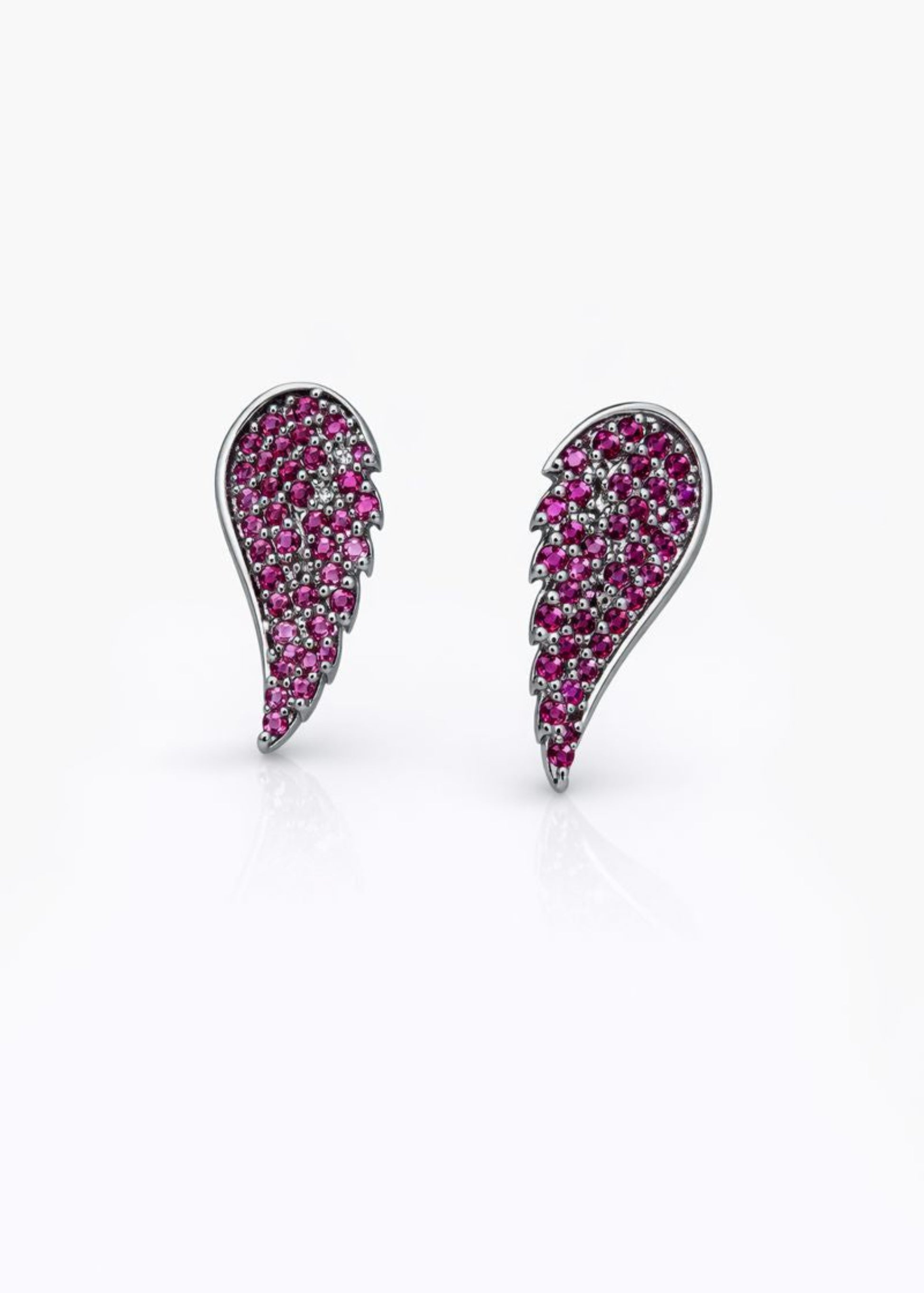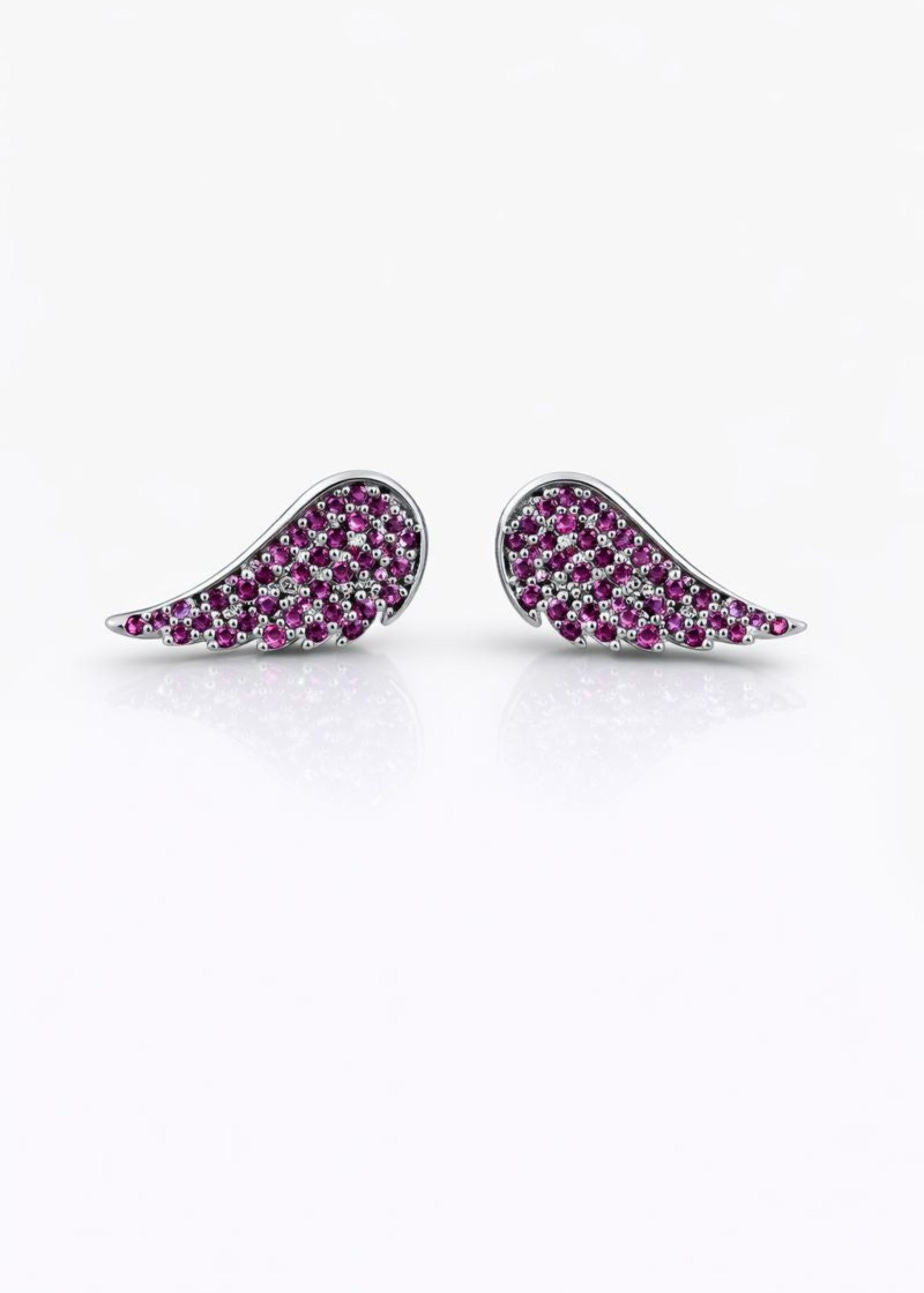 The Crimson Wing Studs are inspired by the graceful curve of angel wings in mid-flight — symbolizing freedom, strength, and quiet elegance. Encrusted with rich ruby-toned pavé stones, these studs radiate warmth and brilliance while maintaining a refined, contemporary silhouette. Designed to feel light yet expressive, Crimson Wing embodies confidence with a soft, feminine edge.