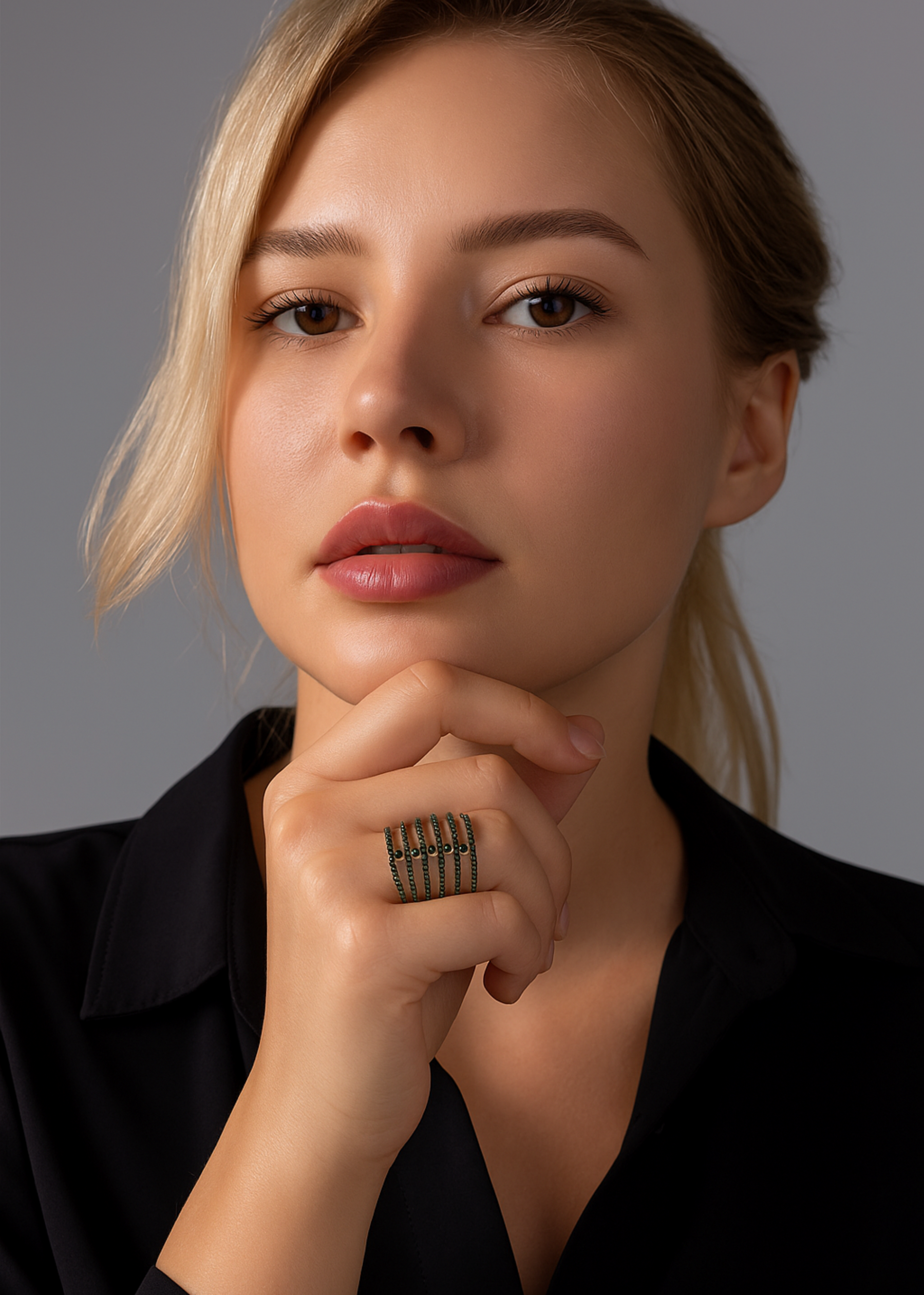 The Emerald Eclipse Ring pairs beautifully with sleek black, white, or neutral outfits. Ideal for evening wear or when you want to elevate your everyday look with refined confidence.