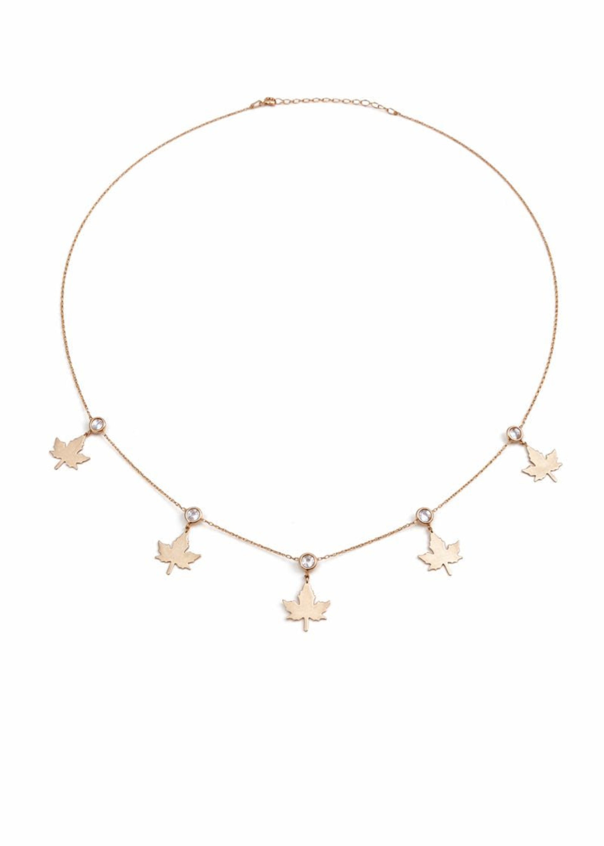 The Golden Maple Charm Necklace draws inspiration from the elegance of nature and the symbolism of the maple leaf—representing strength, balance, and renewal. Delicately arranged along a fine rose-gold chain, each charm adds movement and sparkle, creating a graceful and feminine silhouette.
