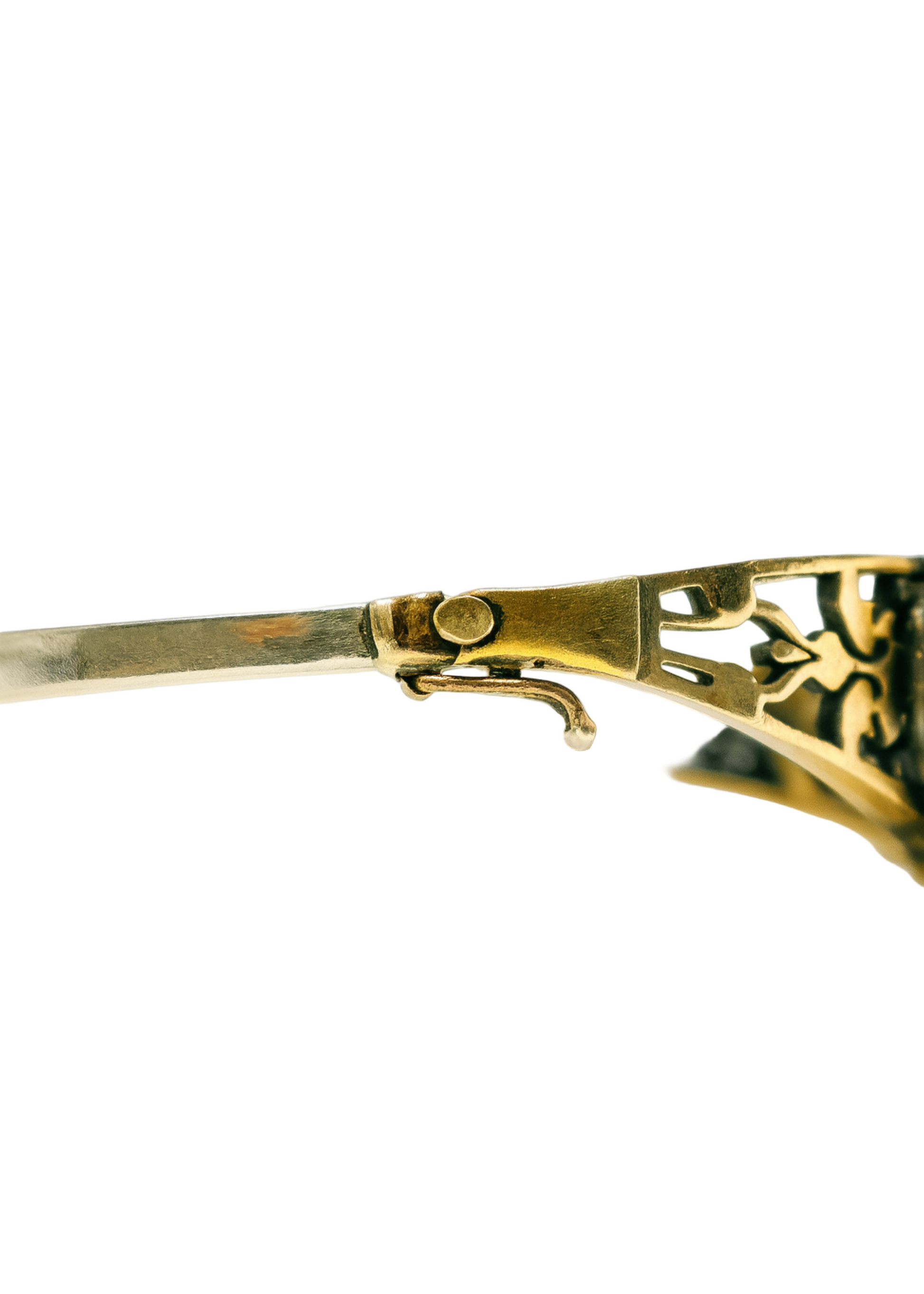 A powerful fusion of heritage and elegance, this Hamsa Hand Bangle is more than just an accessory—it’s a timeless symbol of protection and strength. The bold navy blue zircon stones and intricate antique detailing make it a standout piece with spiritual grace.