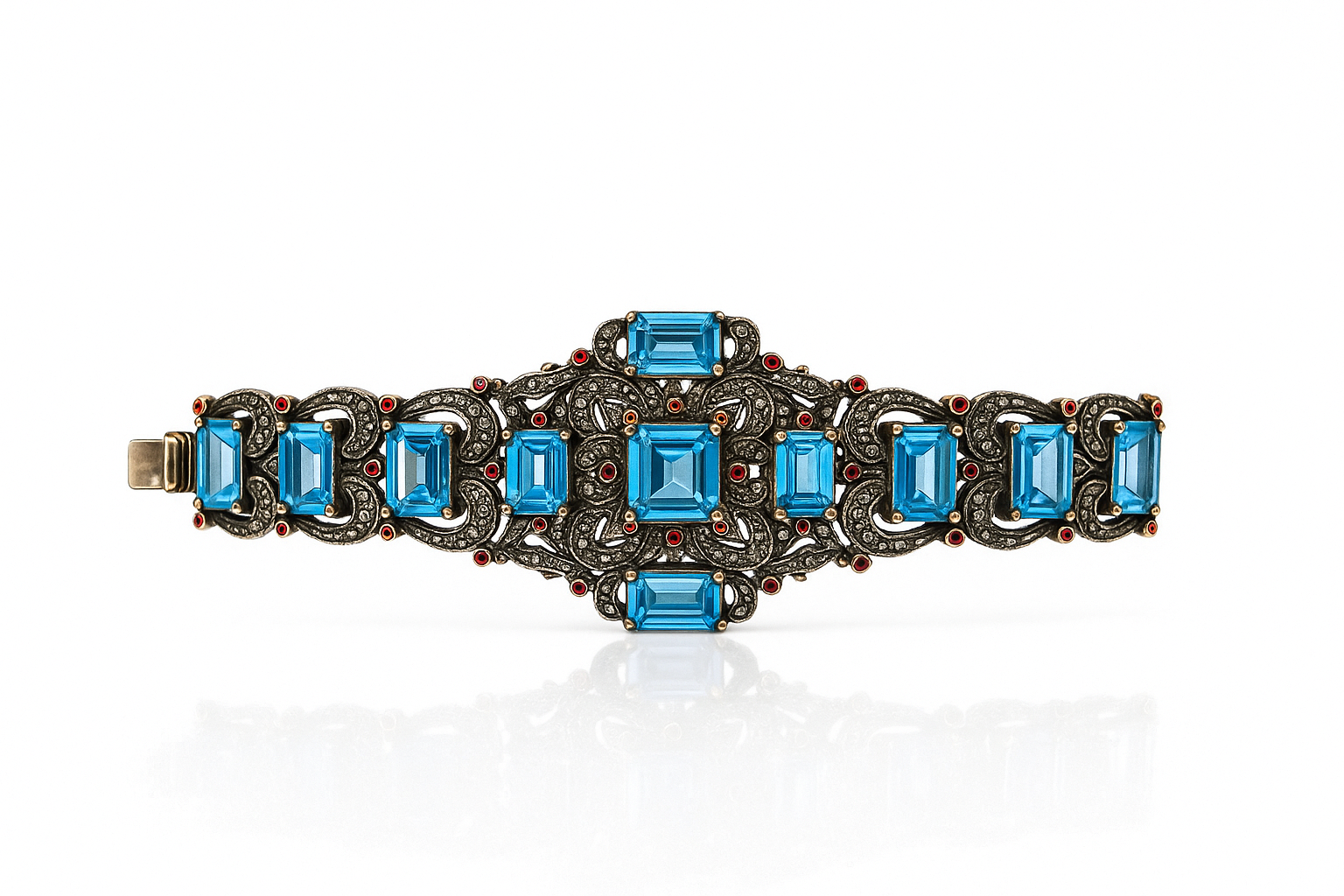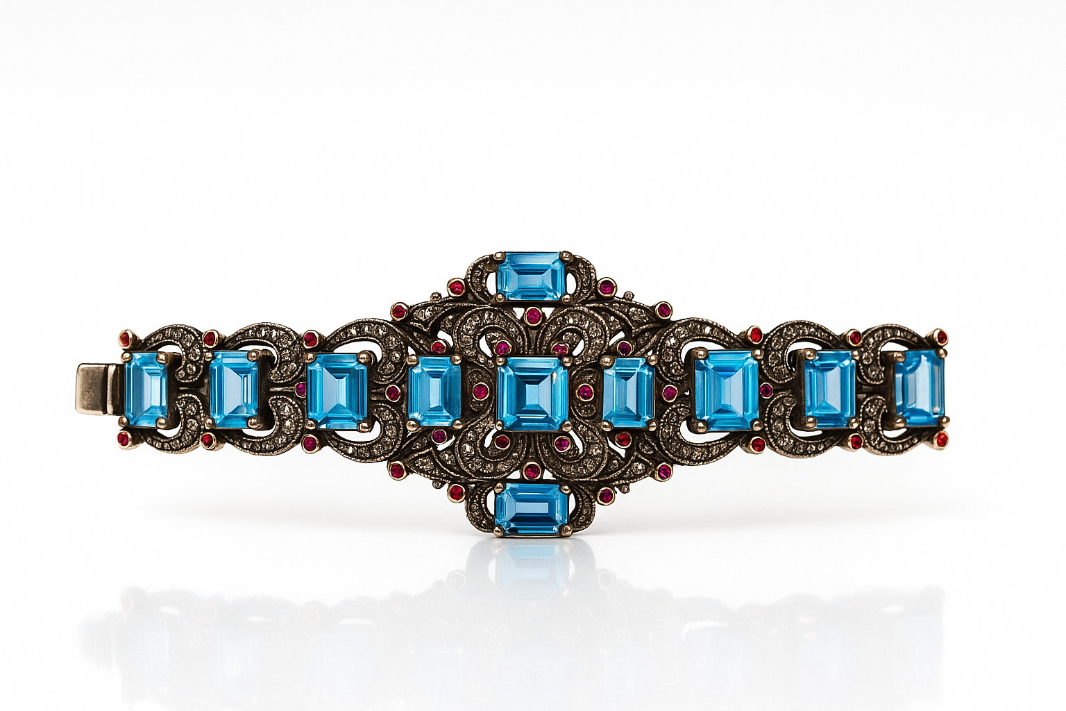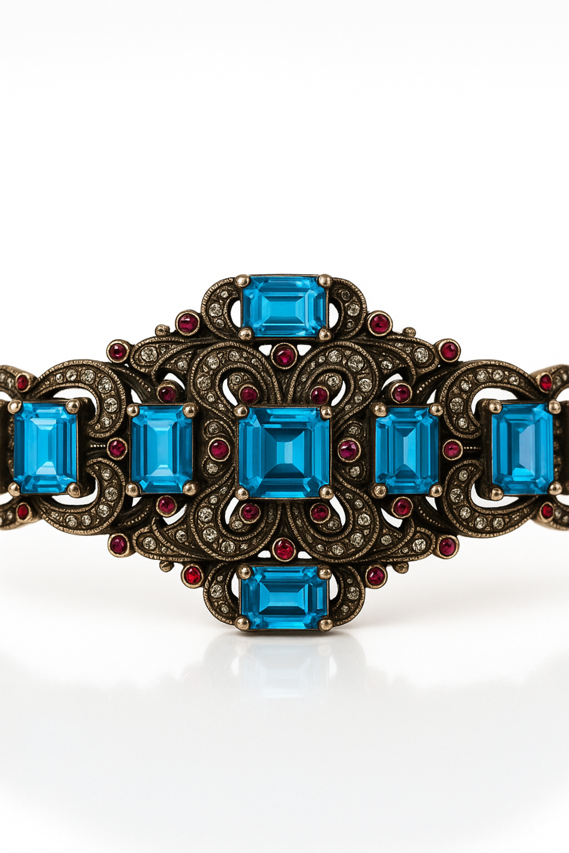 A celebration of imperial elegance, the Imperial Blue Topaz Royale Bracelet radiates majesty and timeless artistry. Inspired by royal court jewels, this statement bracelet features exquisite emerald-cut natural Blue Topaz gemstones, framed by ornate vintage filigree and illuminated with ruby accents and pavé-set sparkle.