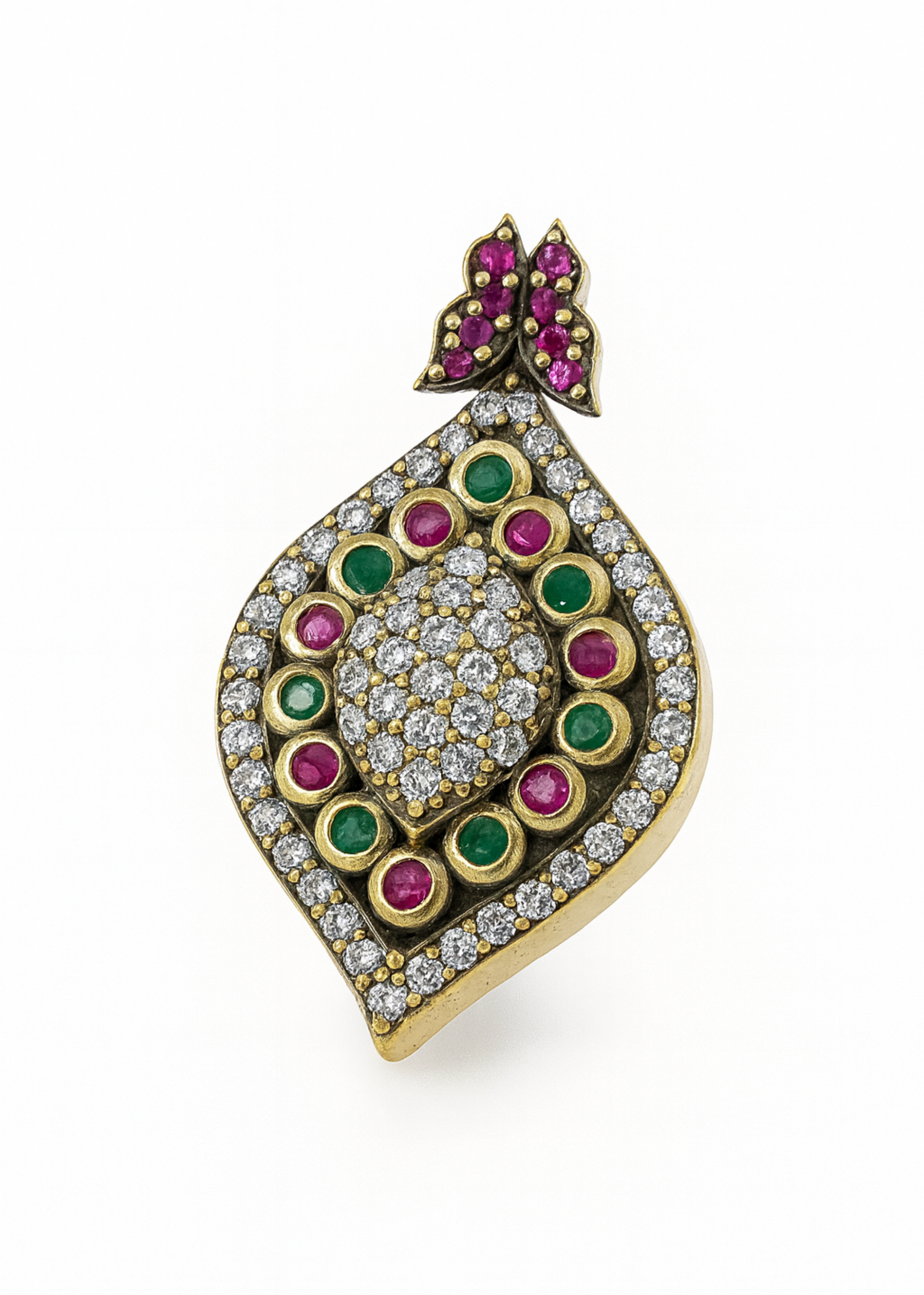 The Imperial Tear-Drop Brooch is inspired by royal Indian heirloom pieces and the grandeur of Mughal gemstone artistry. Its tear-drop silhouette, crowned with a ruby-studded floral motif, symbolizes prosperity, elegance, and timeless celebration. The layered arrangement of emerald-green, ruby-pink, and diamond-tone stones adds depth, vibrance, and a luxurious antique character.