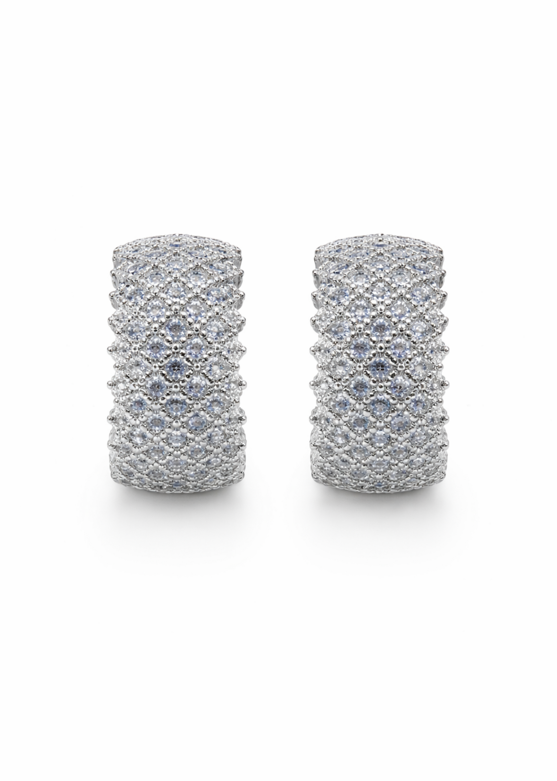 • Bold wide-band hoop silhouette with radiant white pavé setting
