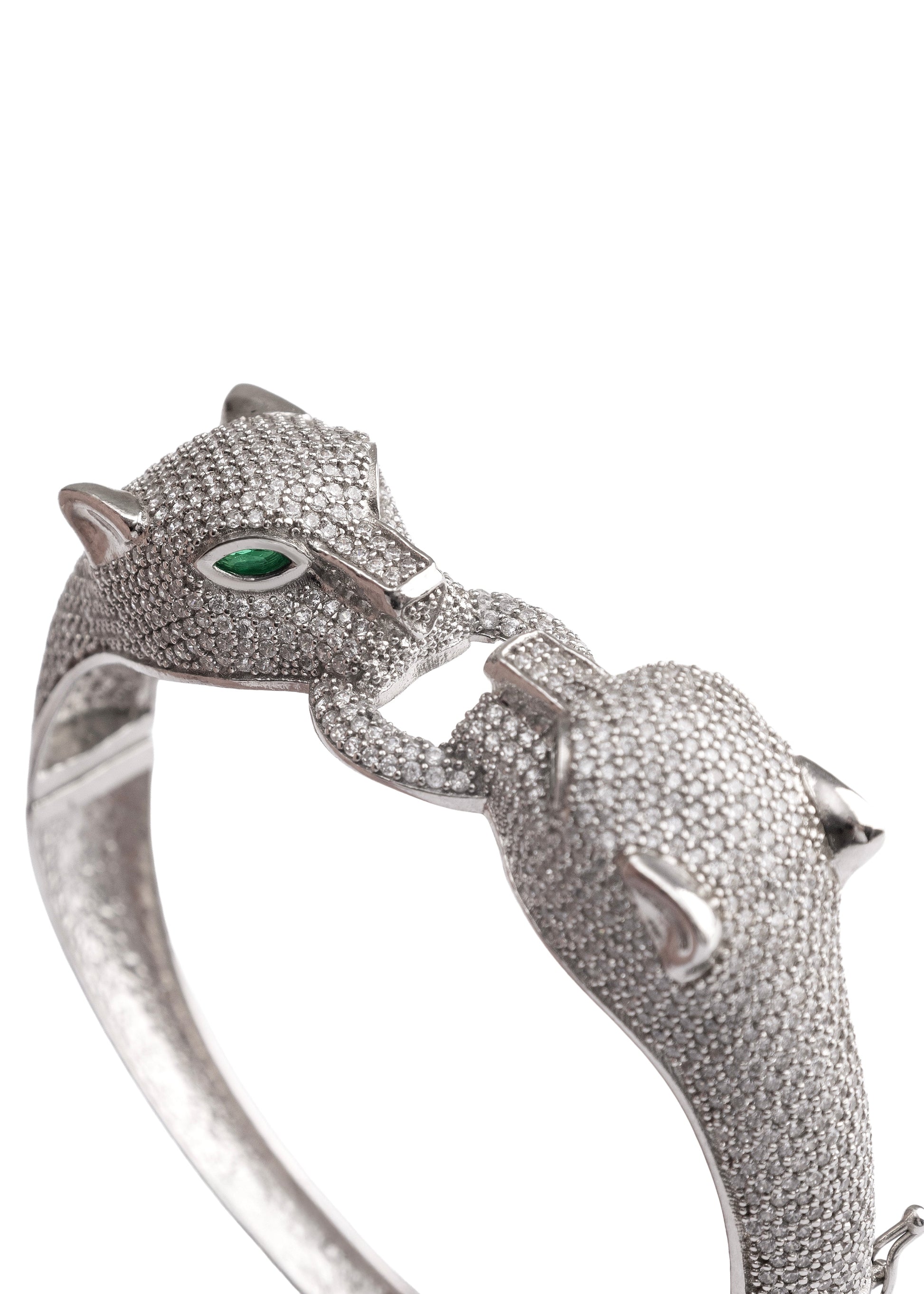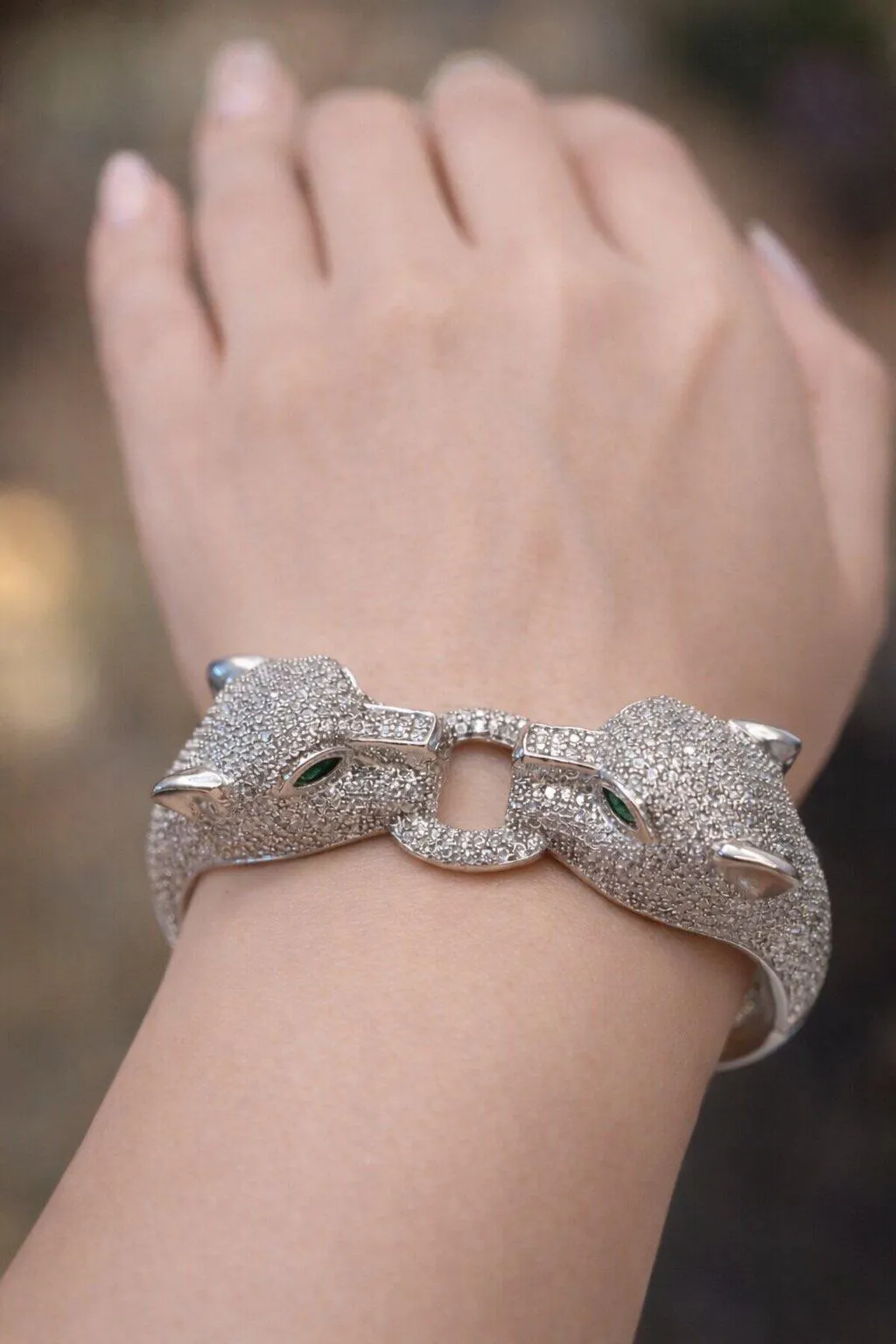 Inspired by the fierce yet graceful panther, the Midnight Panther Bracelet embodies strength, elegance, and mystery. With its piercing green eyes and shimmering silver brilliance, this piece is designed for the woman who embraces power and sophistication in equal measure.