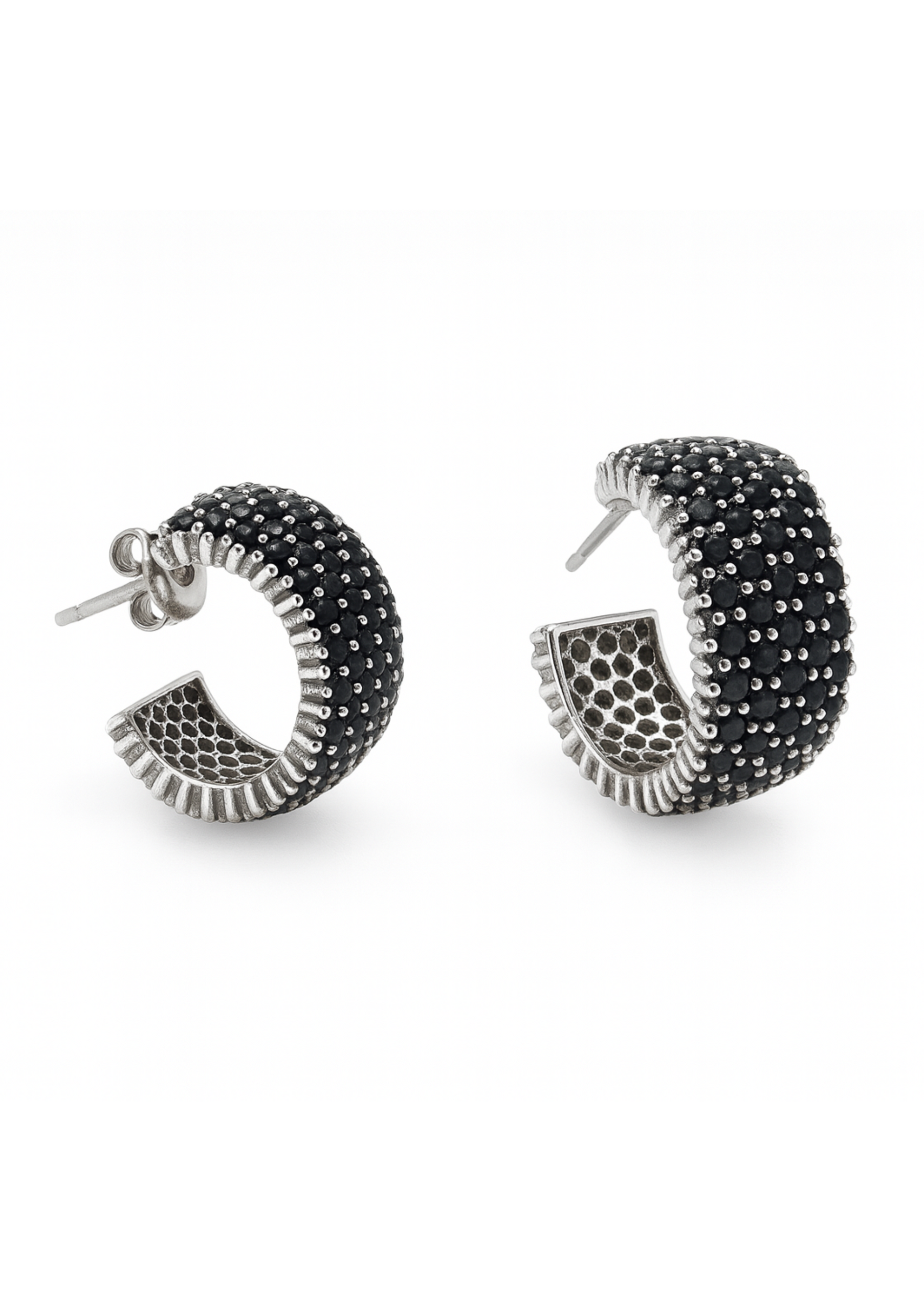 The Midnight Halo Pavé Hoops draw inspiration from the quiet drama of a lunar eclipse — where shadow and brilliance meet in perfect balance. These hoops embody bold elegance through a cascade of deep black stones set against a cool silver base. Designed for the woman who embraces mystery, strength, and modern sophistication, they elevate any look with effortless allure.