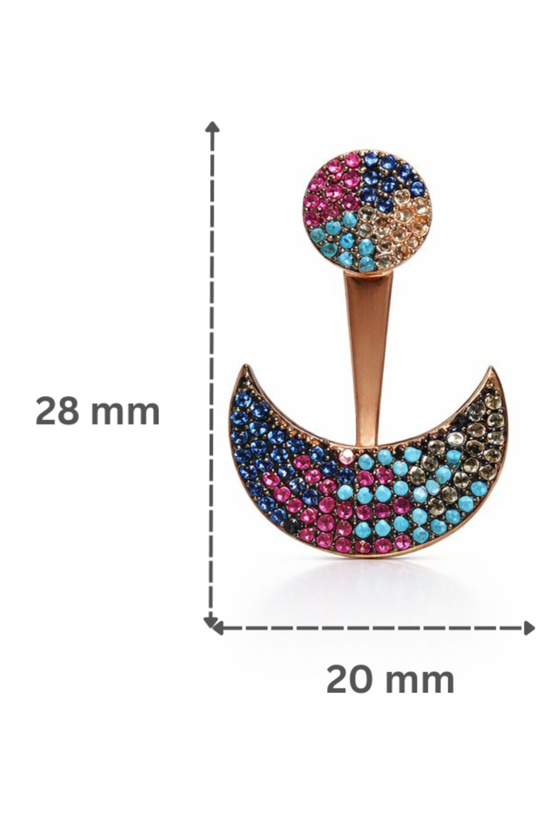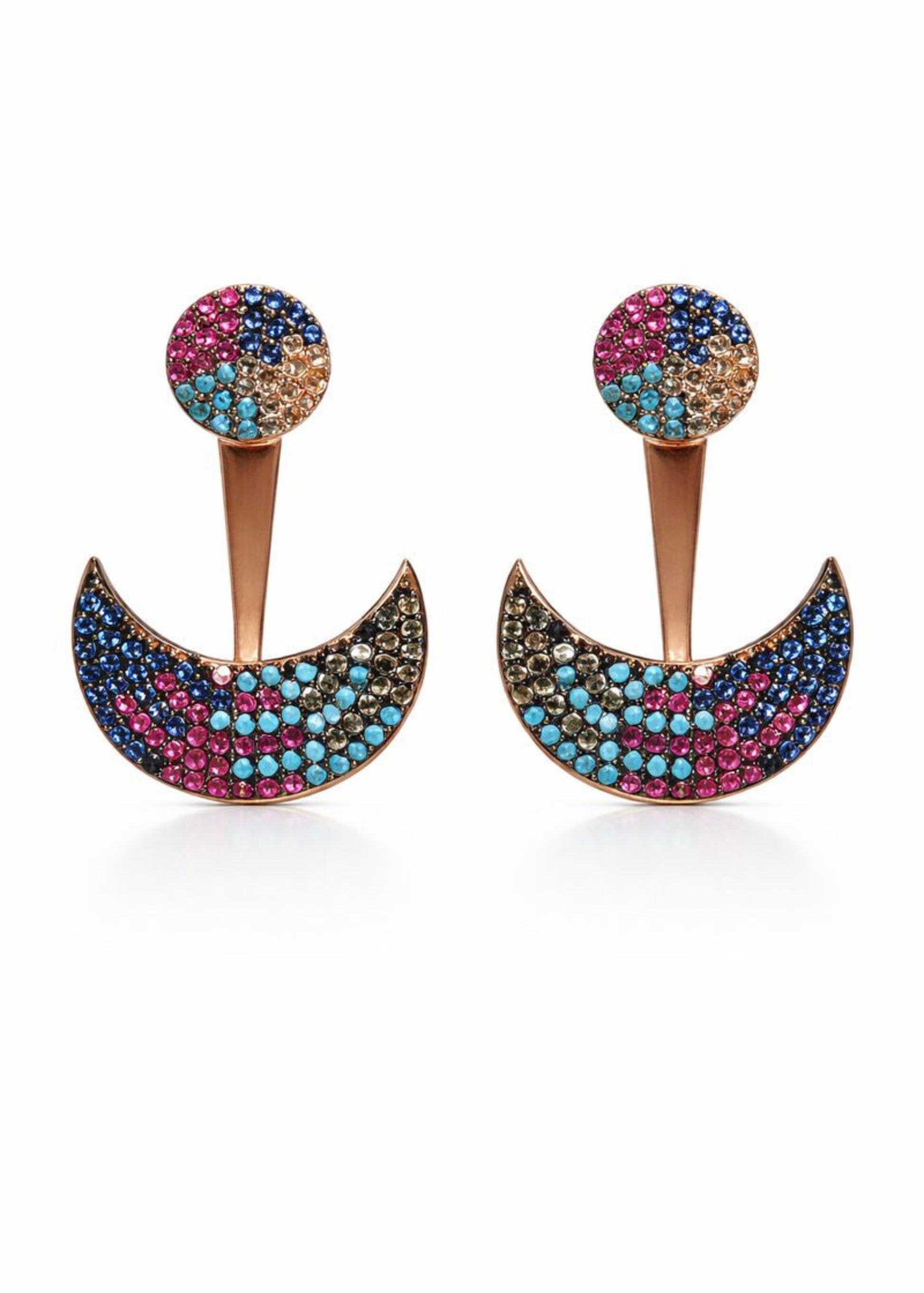 • Crescent-shaped drop element with multi-tone pavé stones in pink, turquoise, gold, and deep blue