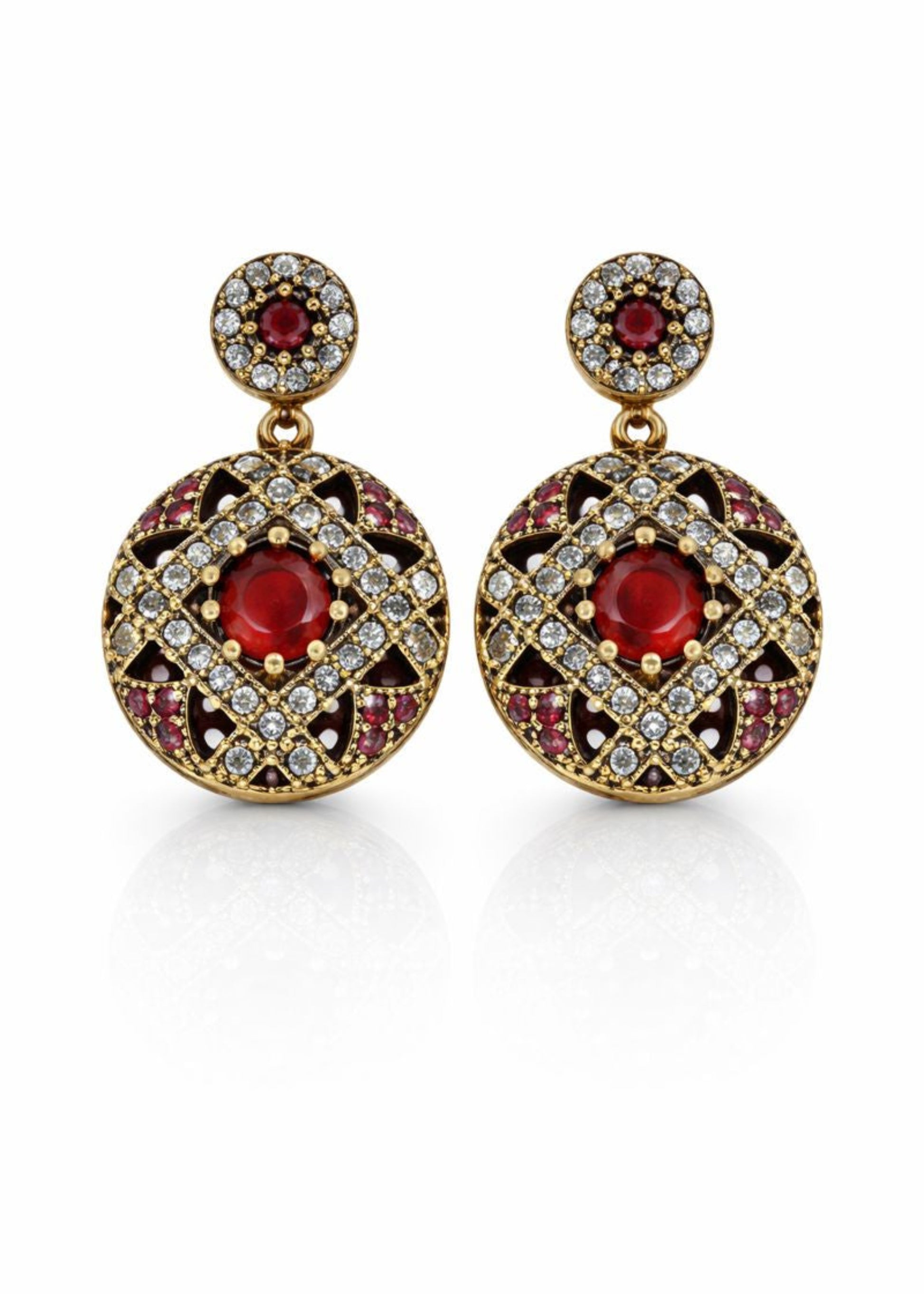 • Deep ruby-red centre stone framed by warm gold-toned metalwork