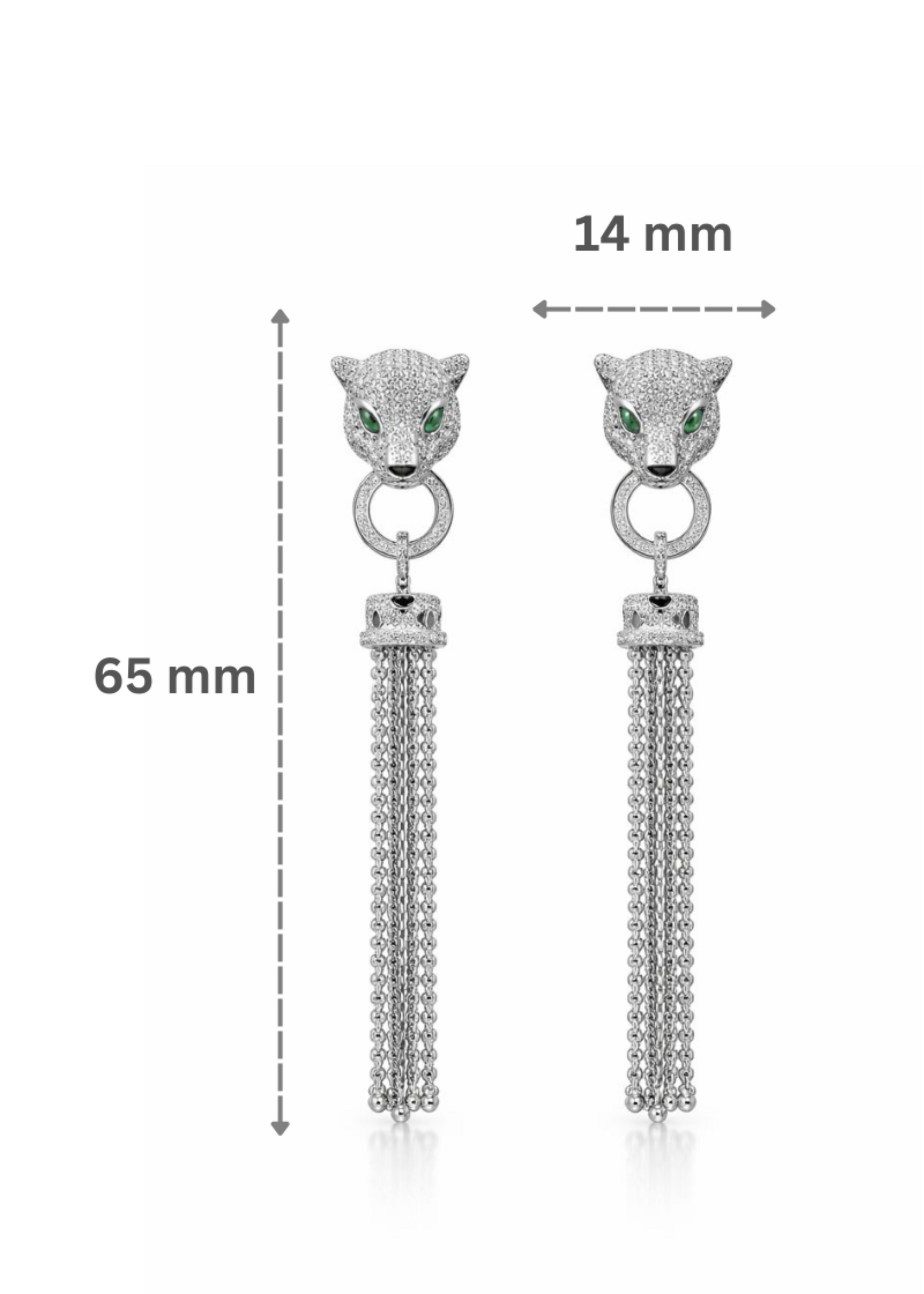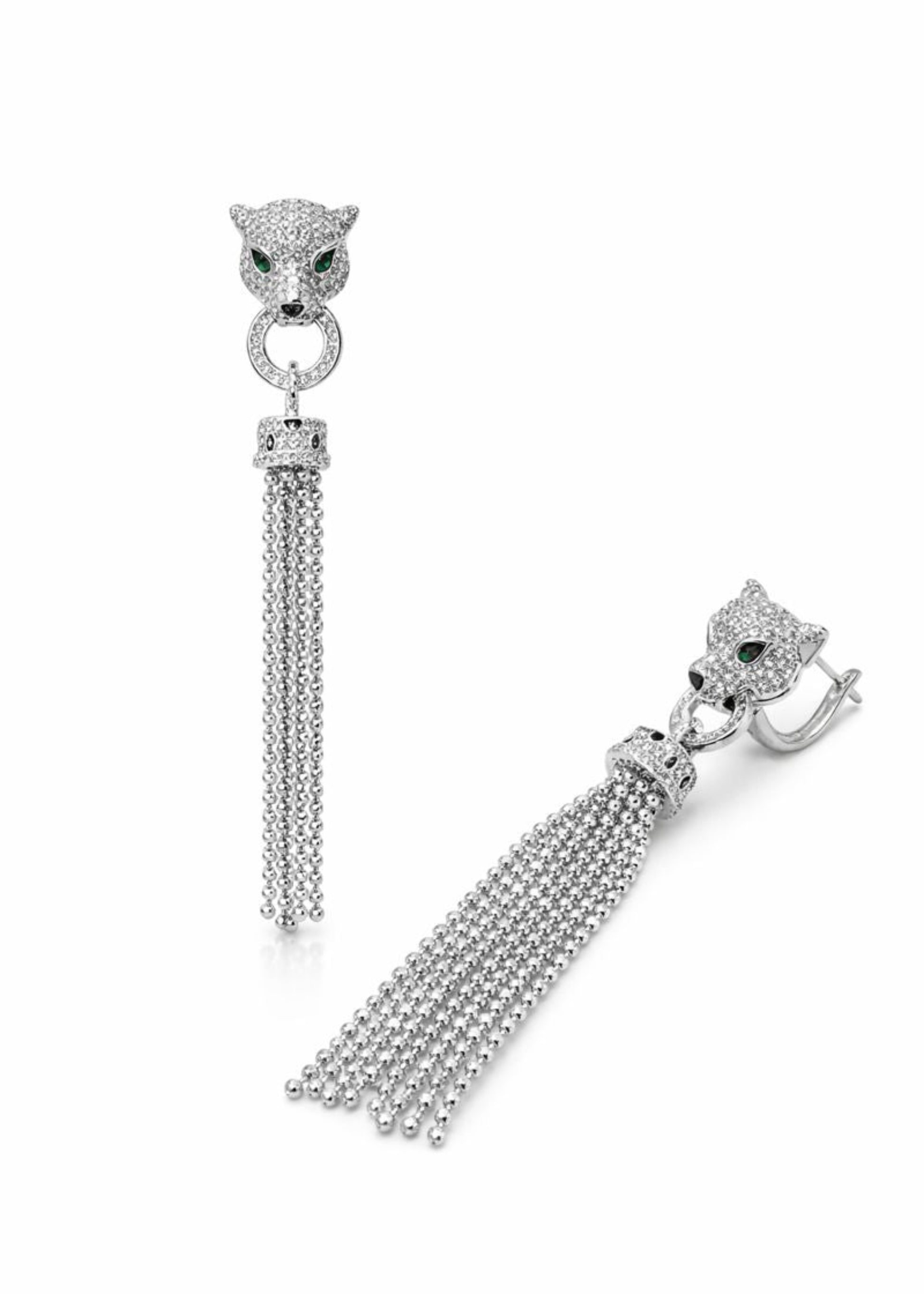 Inspired by the power, grace, and mystery of the panther, these statement drop earrings feature a striking feline motif accented with shimmering stones and captivating green eyes. Finished with flowing chain tassels, they embody confidence, elegance, and bold sophistication.
