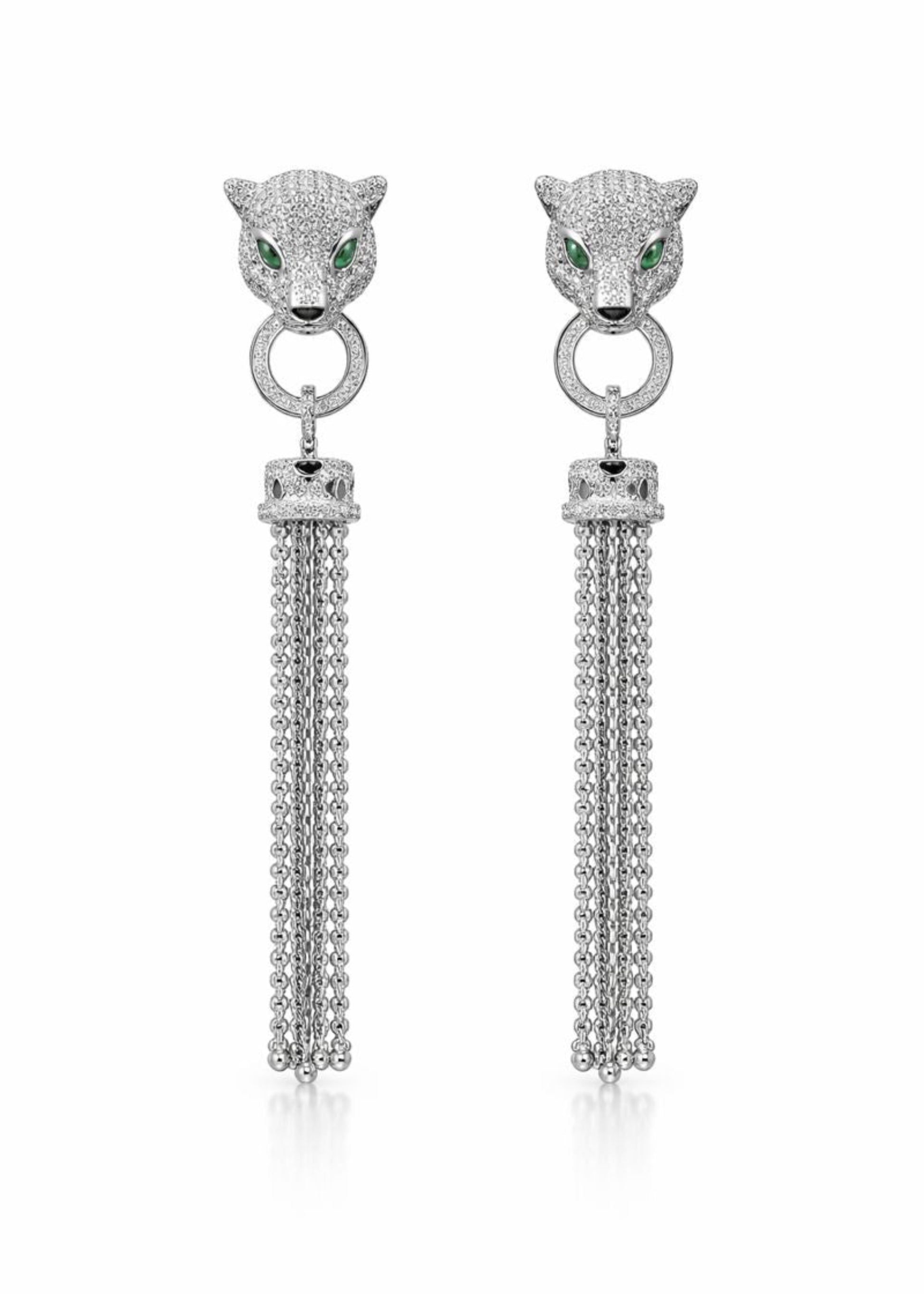 Design: Panther head drop earrings with circular accent and cascading chain tassels