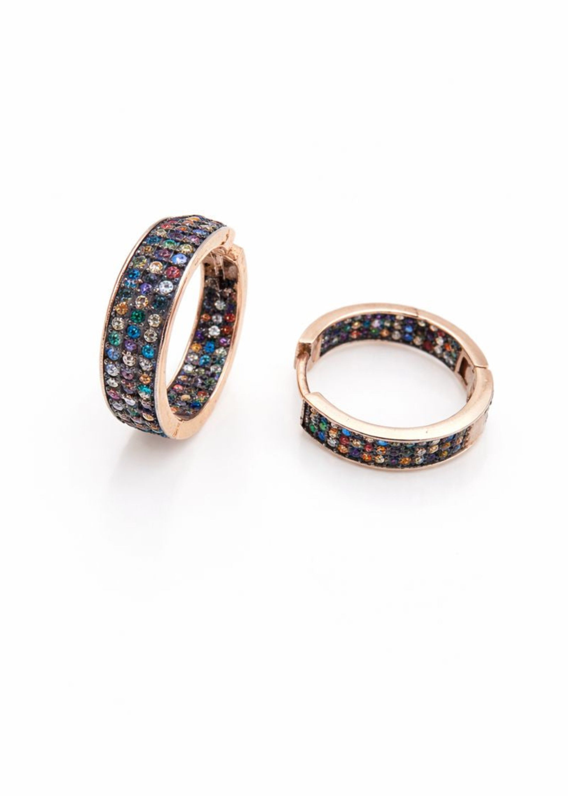 Inspired by the vibrant beauty of a starlit aurora, these hoop earrings feature a dazzling mosaic of multicolored stones set in a warm rose-gold tone. Bold yet refined, they bring color, brilliance, and modern elegance to any jewelry collection.
