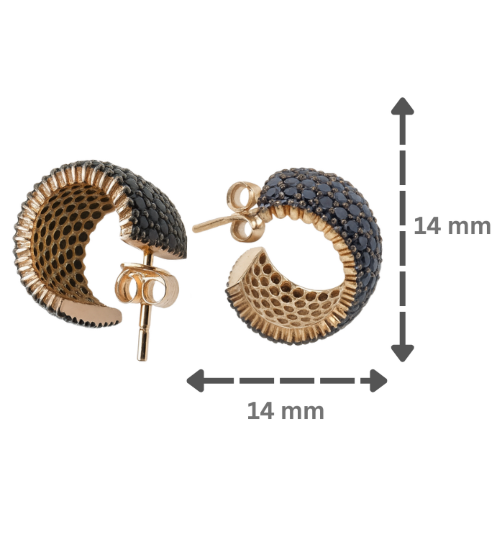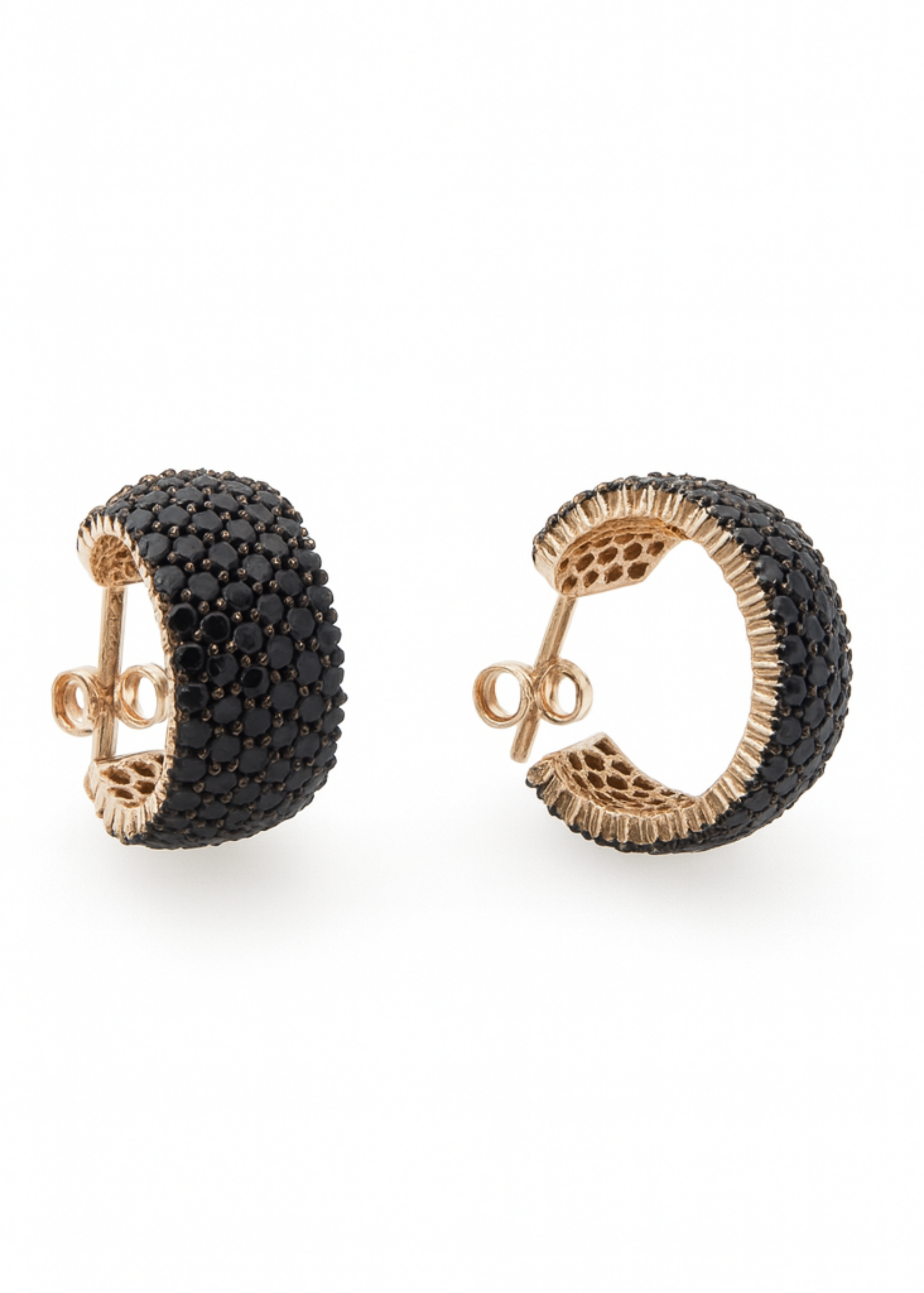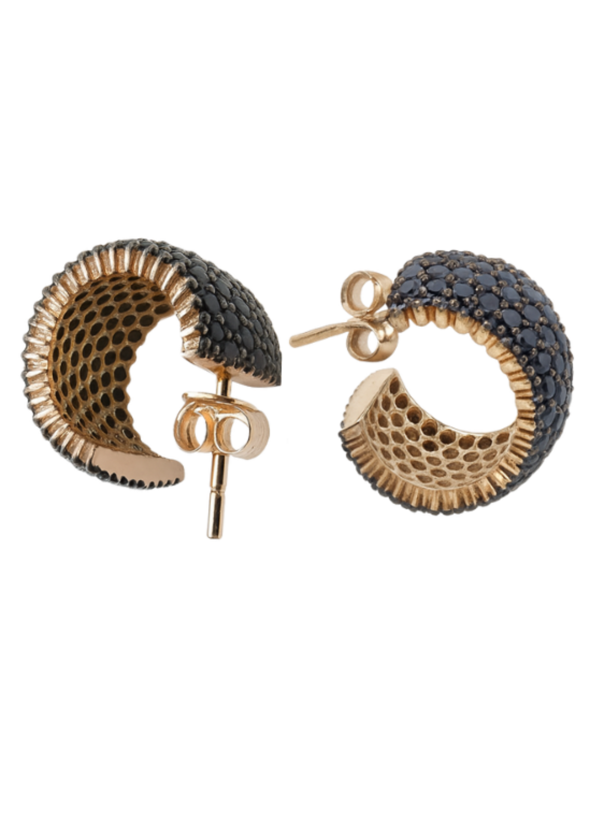 The Radiance Pavé Hoops are inspired by the quiet drama of a solar eclipse — where shadow meets brilliance in perfect harmony. These hoops embody bold sophistication, with deep black pavé stones glowing against a warm golden frame. Designed for women who embrace strength, mystery, and modern elegance, they make a striking statement from every angle.