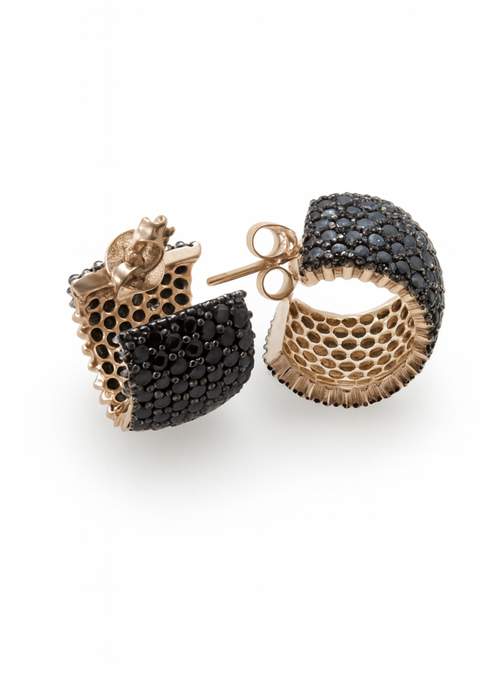 • Dramatic wide-band hoop silhouette with rich black pavé detailing