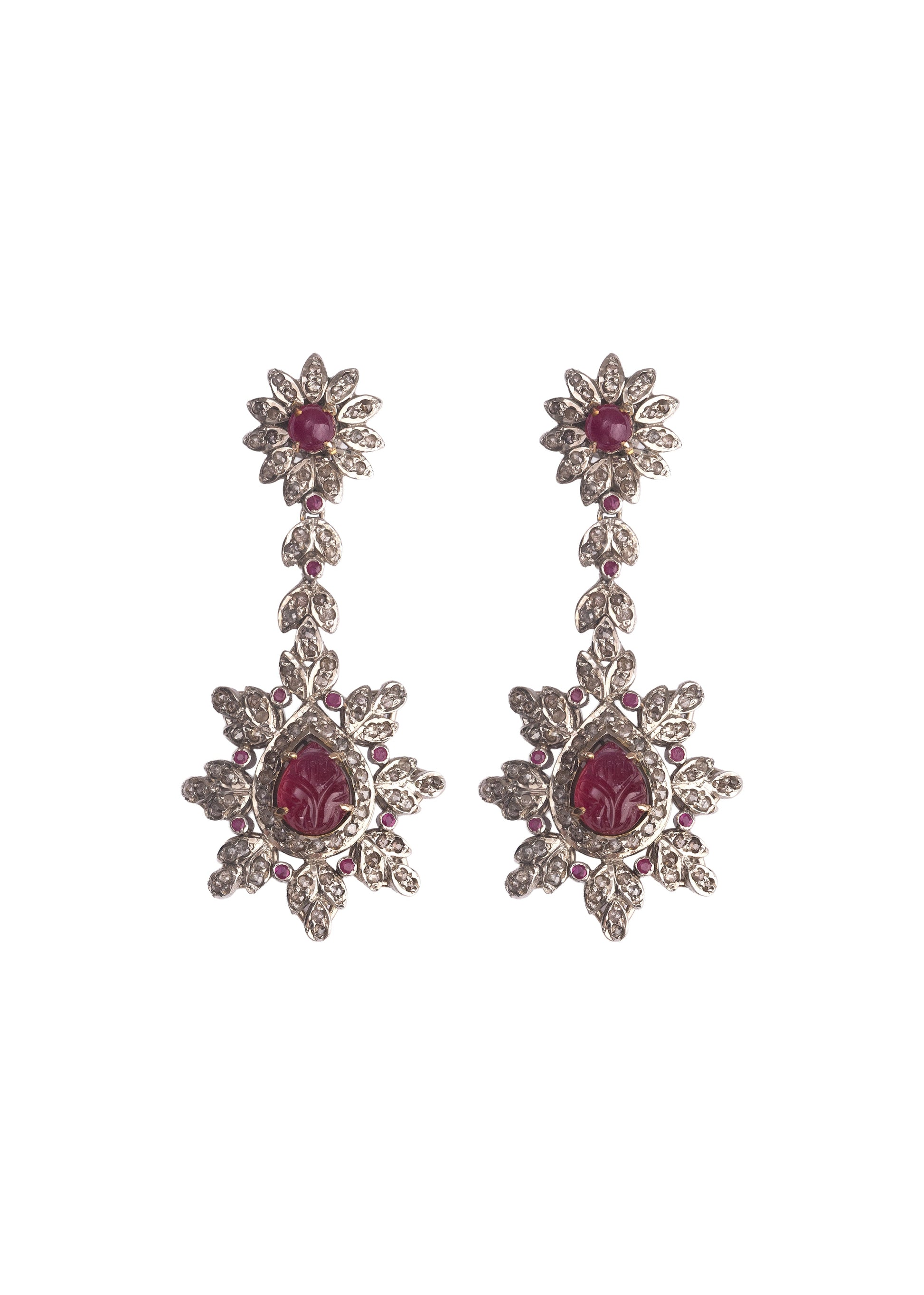 Introducing the Regal Ruby Bloom Earrings — an ode to timeless luxury and old-world charm. This masterpiece marries heritage craftsmanship with royal elegance, featuring hand-carved ruby gemstones surrounded by shimmering diamonds, all set in antique-finished sterling silver.