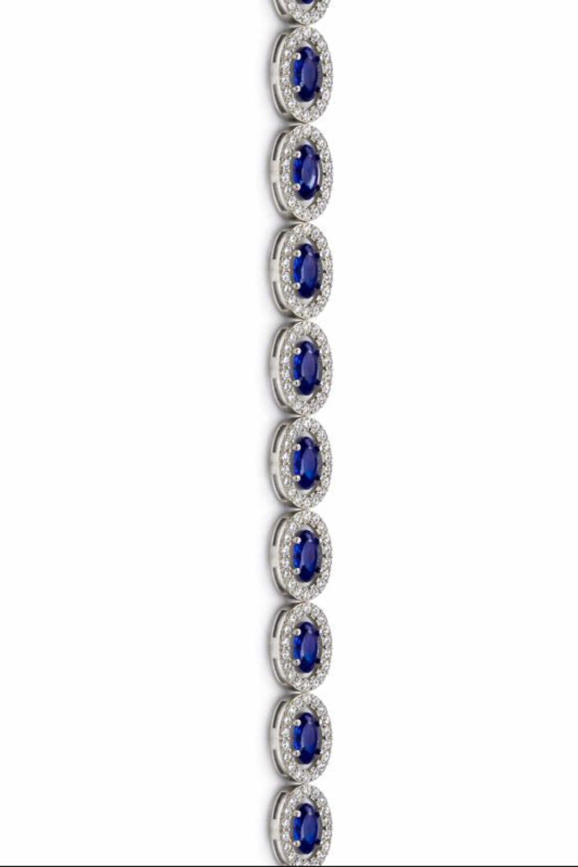 This luxurious bracelet is inspired by timeless royal jewelry, featuring deep sapphire-blue stones framed by shimmering halos. Each link is crafted to reflect sophistication and elegance, creating a bracelet that stands out with graceful brilliance.