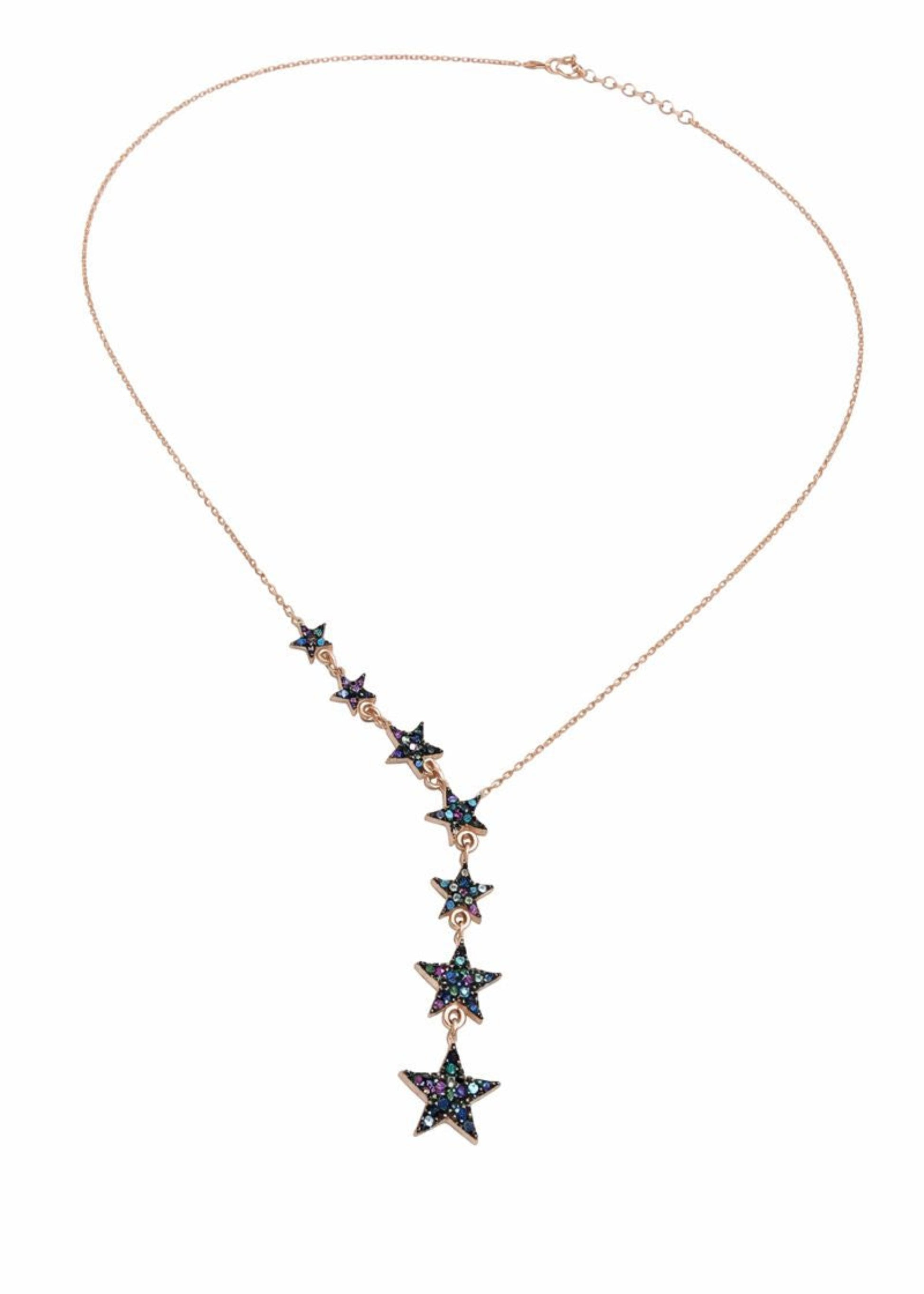 The Star Cascade Necklace is inspired by constellations and the poetic beauty of falling stars. Designed to mimic a sparkling trail across the night sky, each star is embellished with multicolored stones that shift beautifully with movement and light.