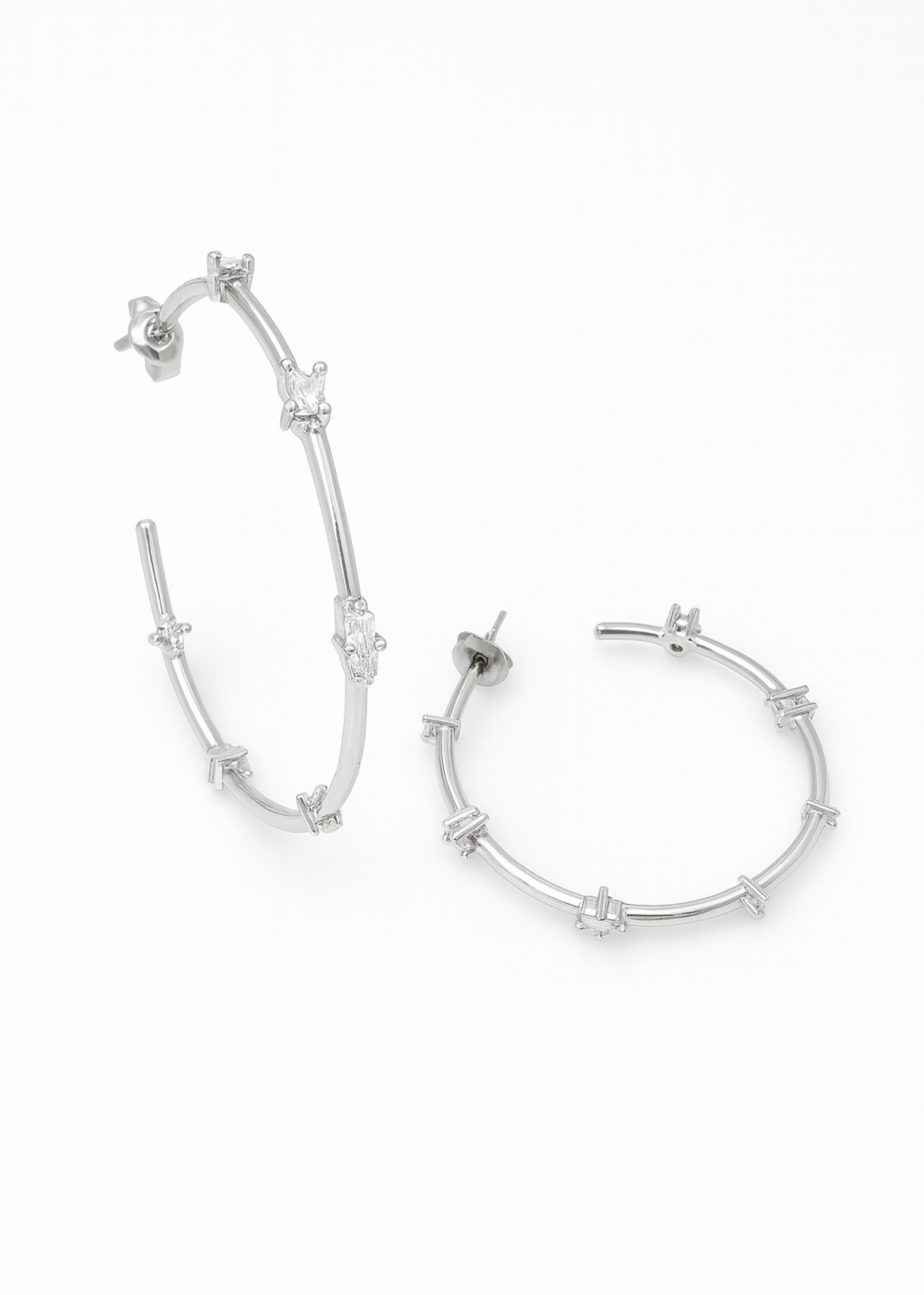 The Starlit Linear Hoops take their inspiration from the delicate pattern of stars aligned across the night sky in graceful, linear formations. Each zircon — placed with intentional spacing — resembles a guiding star, creating a poetic balance of minimalism and brilliance. The clean, elongated silhouette mirrors the elegance of moonlit pathways and celestial horizons.