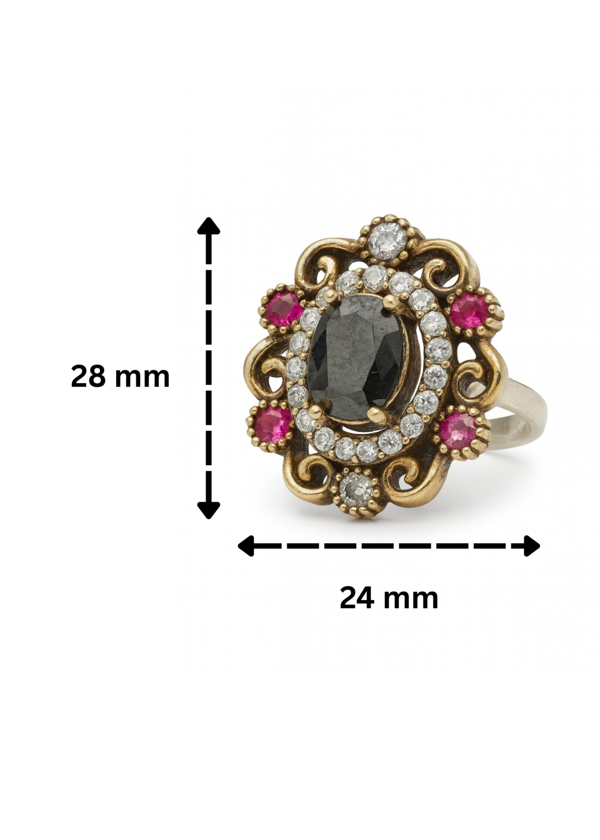 Antique gold & silver finish with black stone, ruby accents & zircon detailing