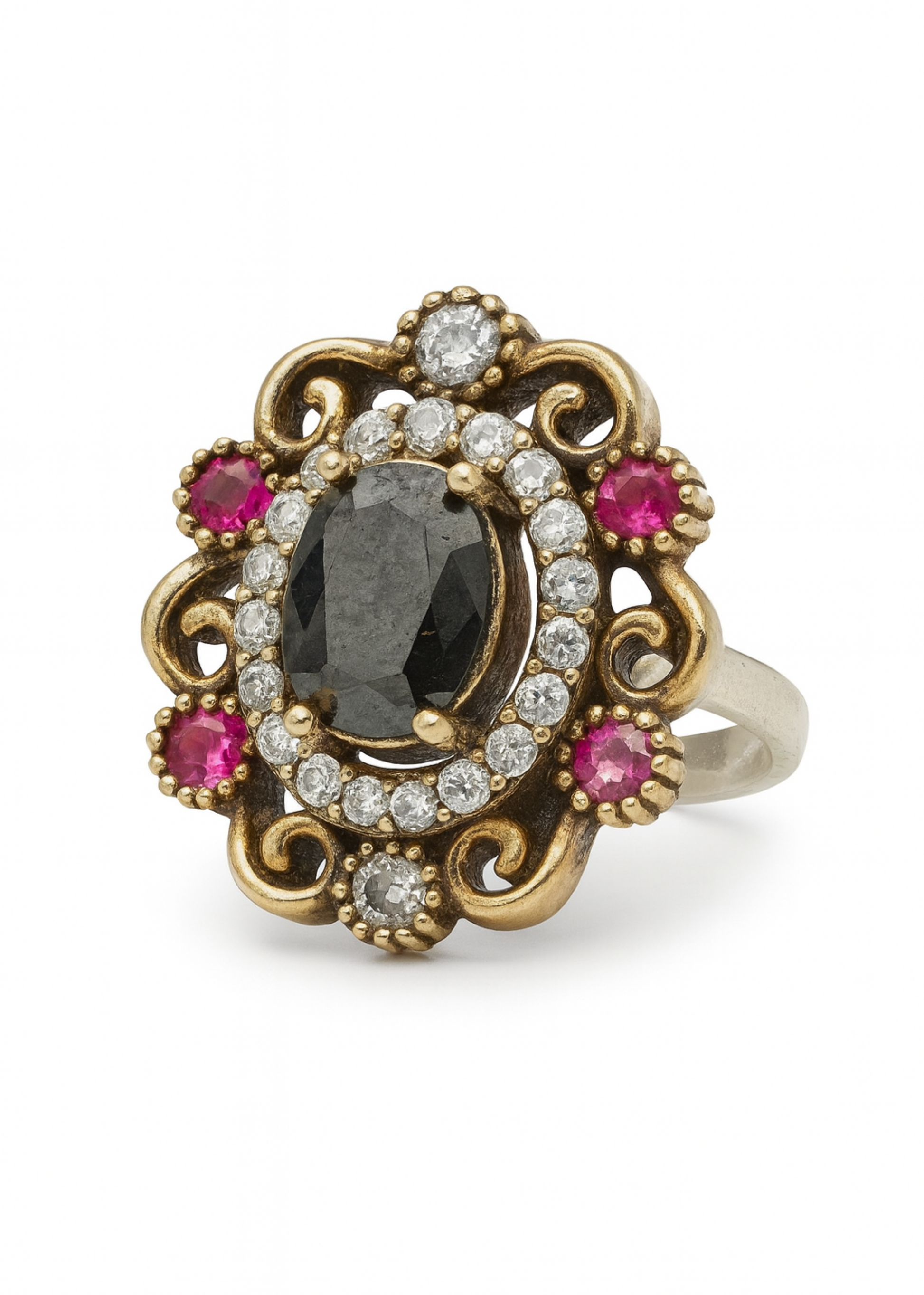 Rooted in vintage elegance and baroque splendor, the Aurelia Statement Ring is a radiant ode to regal beauty. Featuring a deep black faceted centerpiece encircled by shimmering white zirconia and ruby-toned stones, this masterpiece channels timeless sophistication with a bold, dramatic flair.