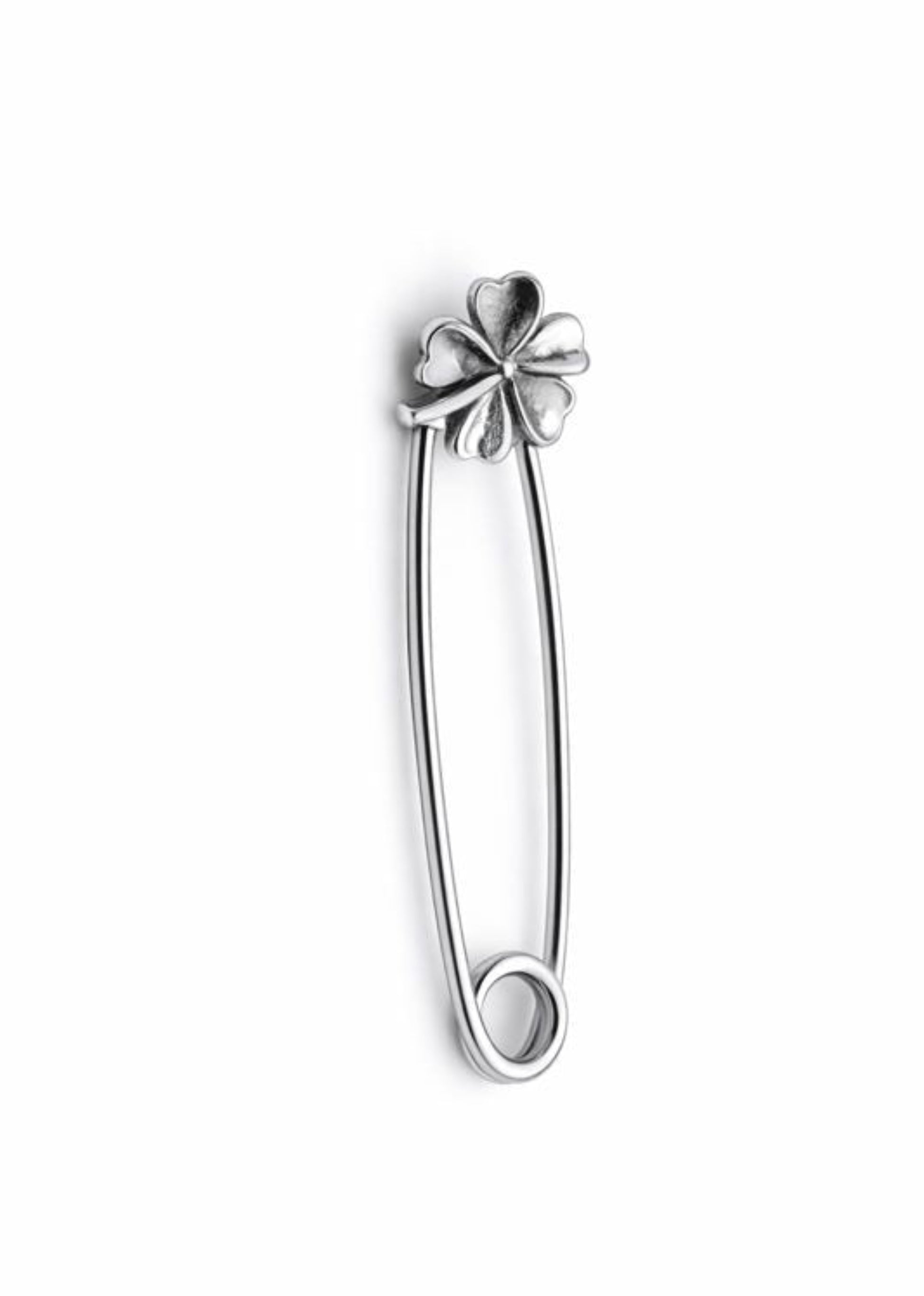 · Design: Classic safety pin with a four-petal flower charm.