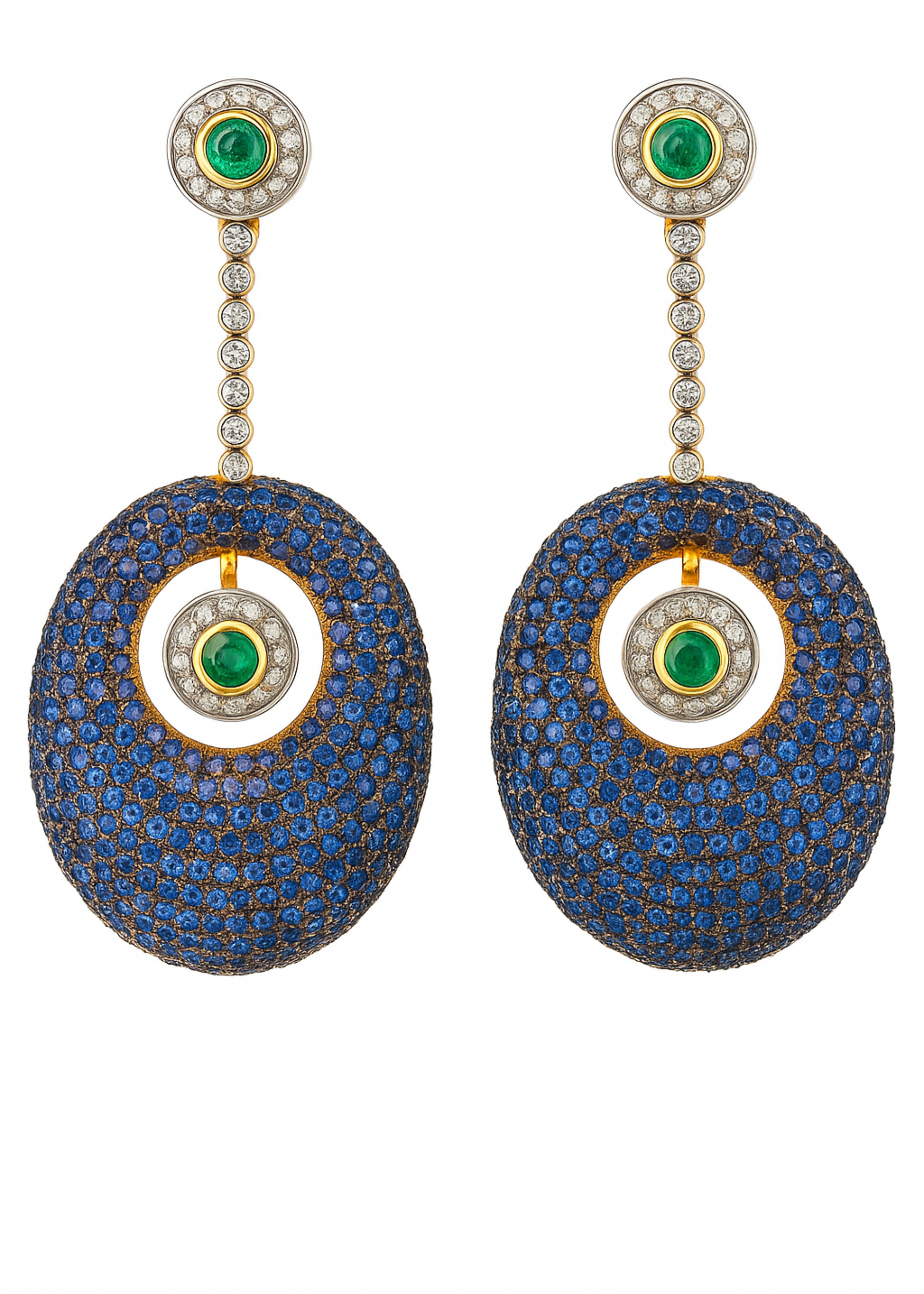 The oval silhouette, encrusted with deep blue stones, frames a luminous emerald centerpiece encircled by golden halos — symbolizing elegance in motion. Each detail, from the pavé setting to the sleek black chain, reflects exceptional craftsmanship and contemporary finesse.