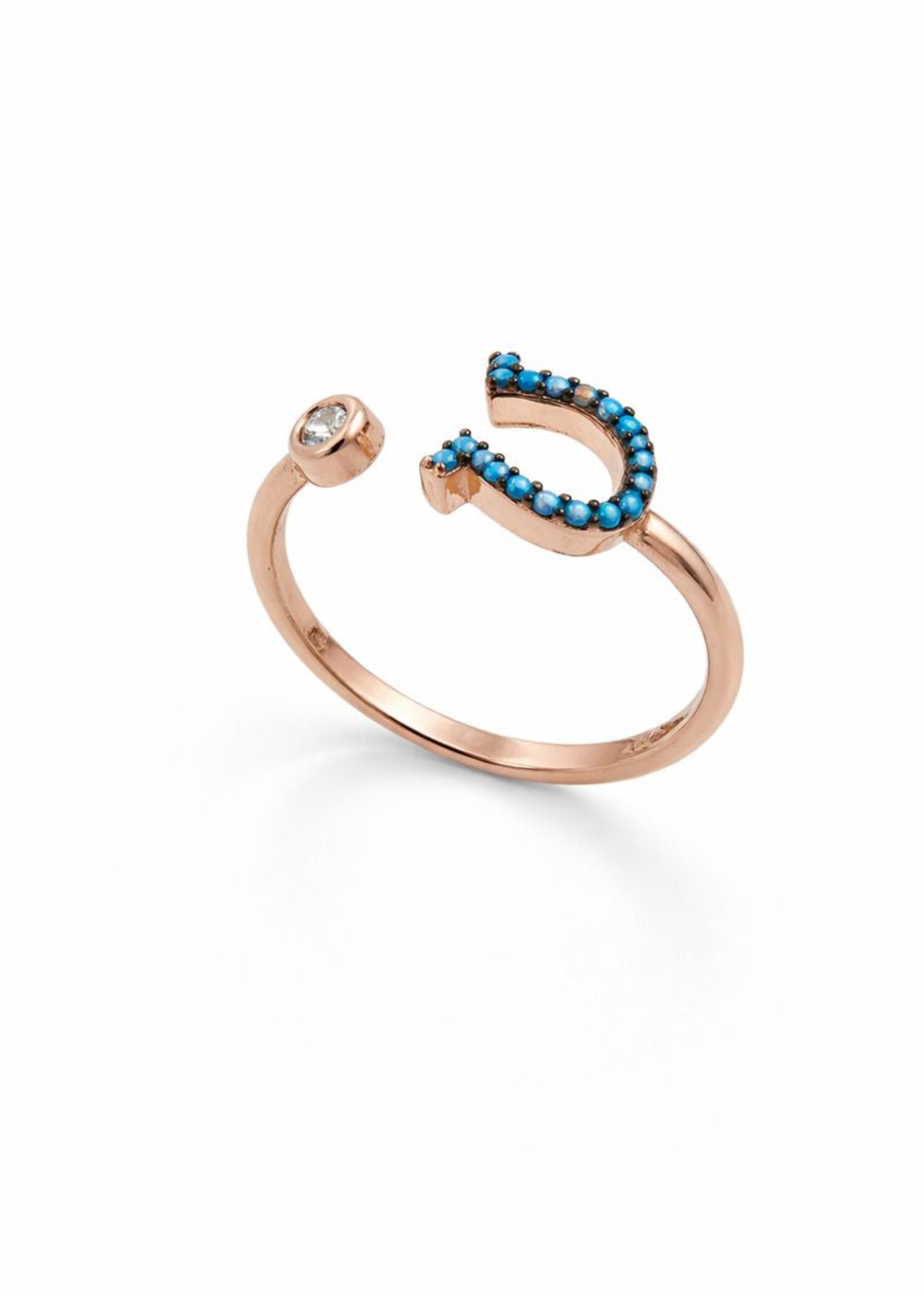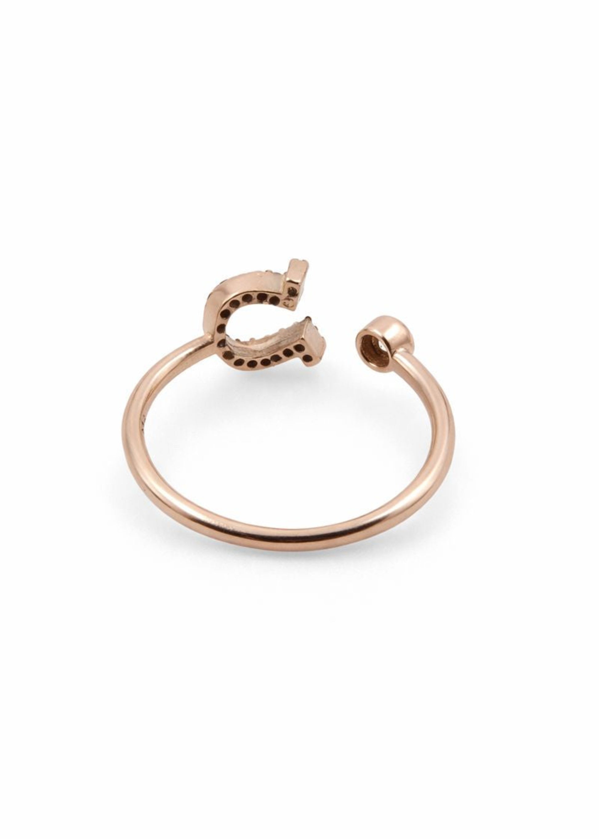 Crafted as a symbol of positivity and good fortune, this elegant ring features a sleek open-band design adorned with a sparkling horseshoe motif. Set in a warm rose-gold finish, the ring blends modern minimalism with a touch of meaningful charm—perfect for everyday wear.