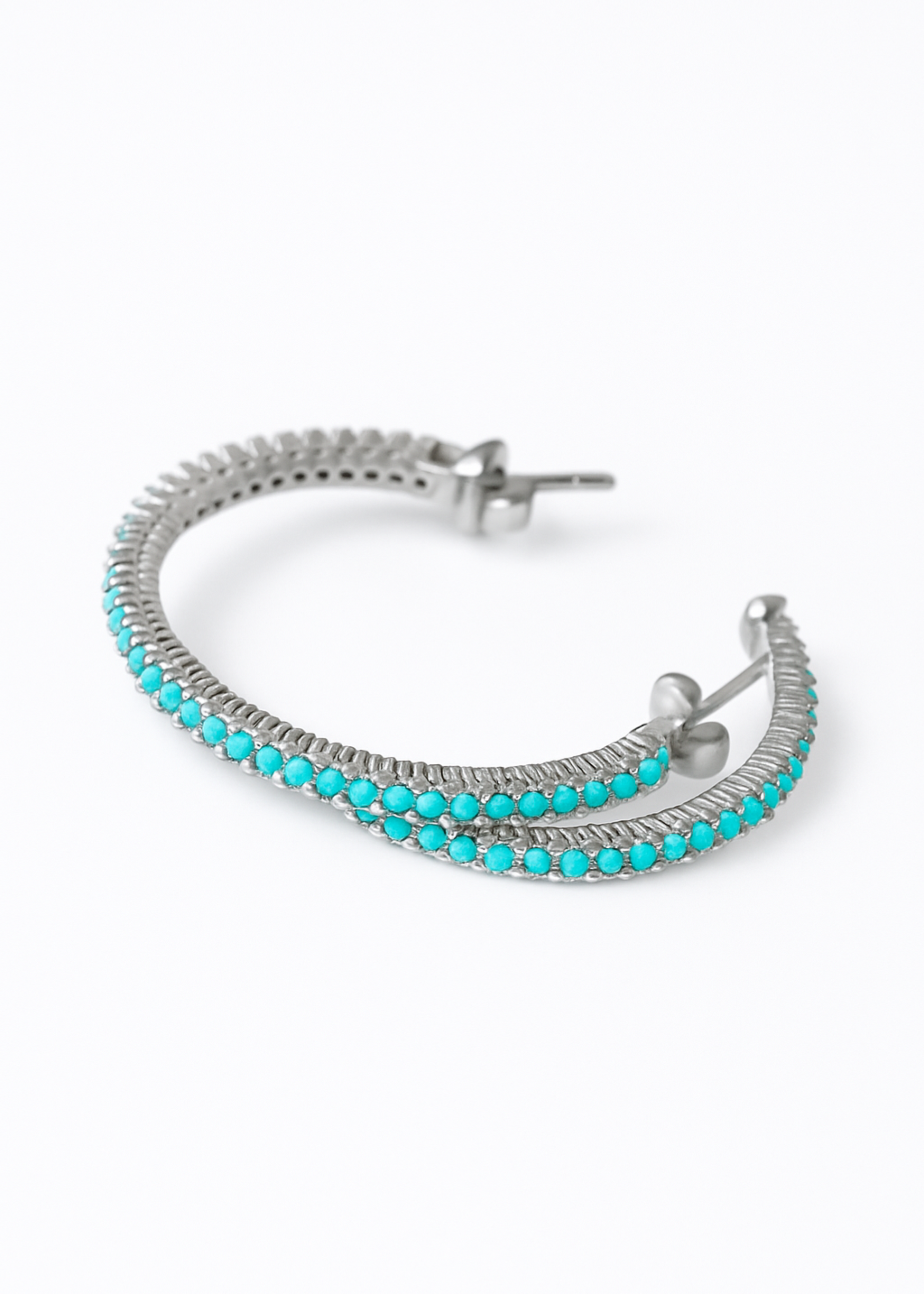 Drawing from the rich legacy of Ottoman design and modern edge, the Turquoise Noir Hoops strike a perfect balance between vintage grit and contemporary elegance. The deep oxidized silver finish, paired with a striking line of turquoise stones, makes this piece feel both bold and grounded, ideal for statement minimalist lovers.