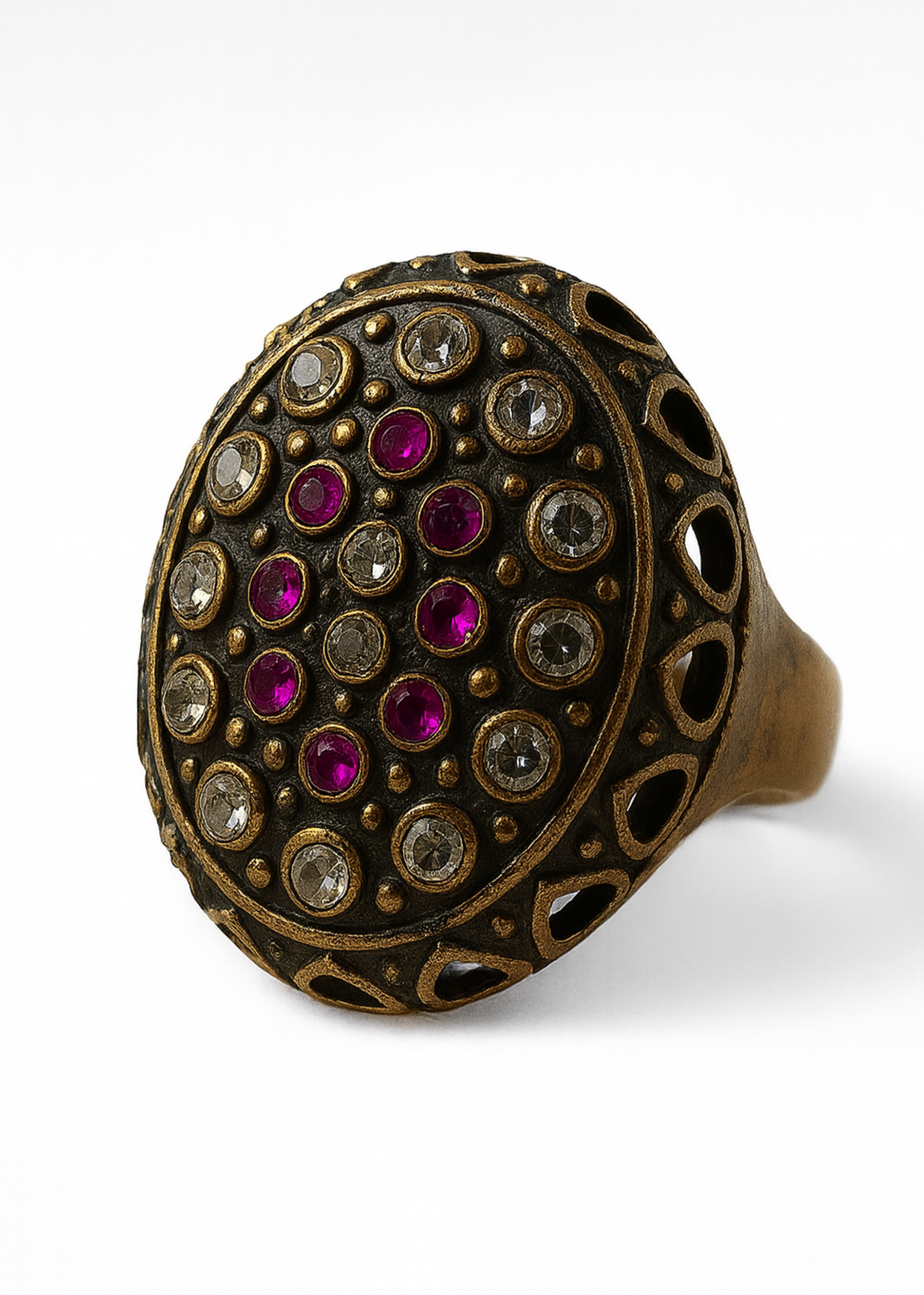 Drawing from the mystique of ancient empires and the rich allure of heirloom treasures, the Vintage Garnet Dome Ring channels bold individuality with antique grace. Its oxidized gold finish and garnet-inspired stones echo a regal story of the past, reborn for today’s statement maker.