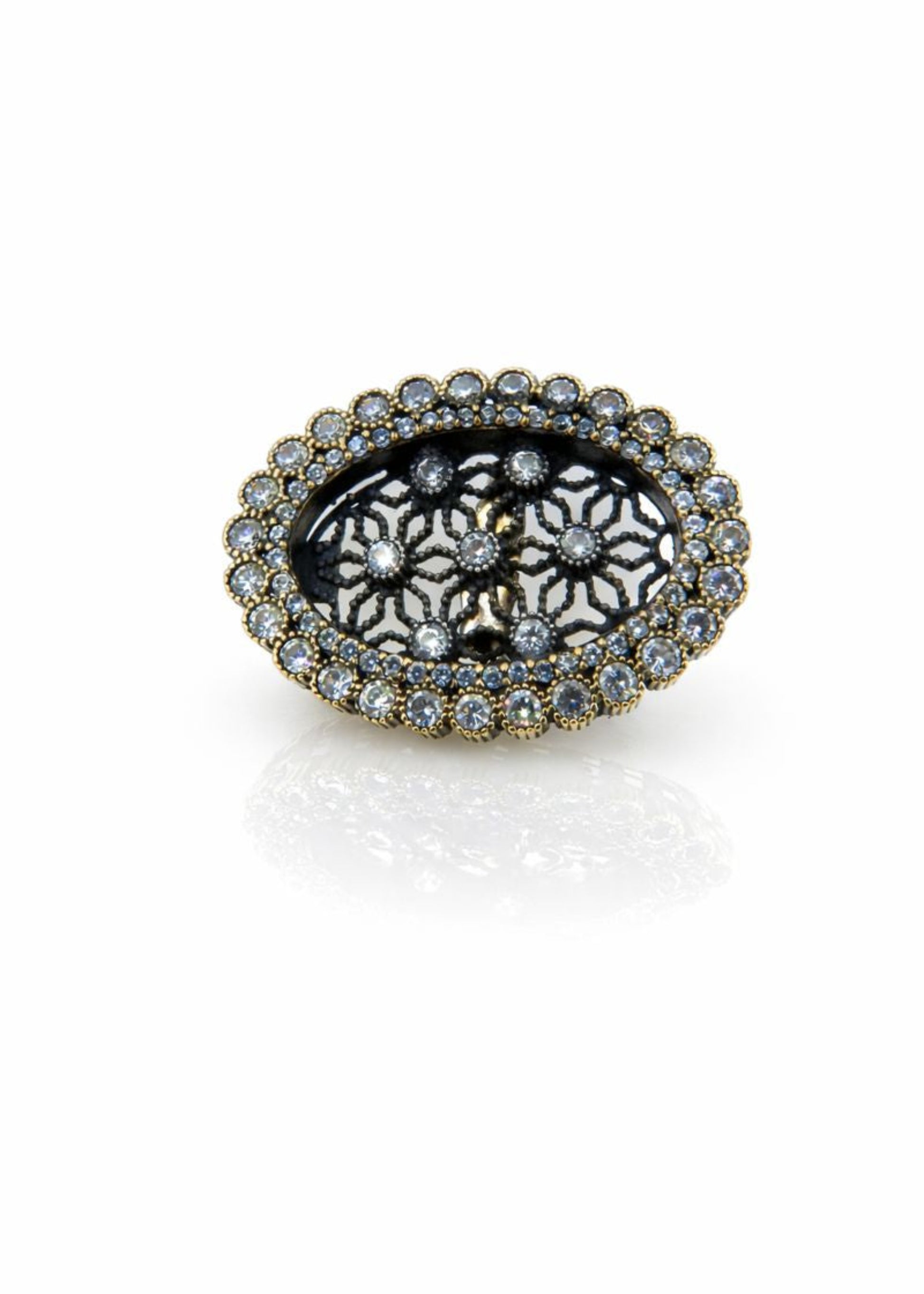 The Vintage Oval Radiance Brooch draws inspiration from old-world royal insignias and intricate palace jali (lattice) architecture. Its elegant oval silhouette features a detailed filigree pattern at the center, symbolizing heritage craftsmanship. Surrounded by two rows of shimmering diamond-tone stones, it delivers a timeless, luminous glow.